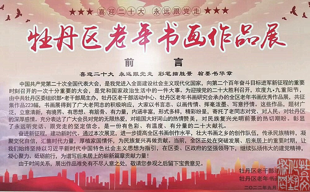 9月28日,为迎接党的二十大胜利召开,欢度九·九重阳节,由牡丹区委组织部·老干部局主办,牡丹区老干部活动中心、牡丹区老年书画研究会承办的全区老年书画优秀作品展,在牡丹区老干部活动中心举行。共征集作品223幅,书画展得到了广大老同志的积极响应,大家以书言志、以画传情、挥毫泼墨、写意抒情。这些作品题材广泛,立意清新,有境界、有思想、有筋骨、有力量,内涵丰富,形式多样,精彩纷呈,寄托了老同志对党、对人民、对牡丹区的深厚感情。充分表达了广大会员对党的无限热爱,对祖国大好河山的热情赞美,对民族复兴光明前景的热切期盼。彰显了永远听党话、跟党走的坚定信念,是一份有色彩、有温度、有分量的二十大献礼。