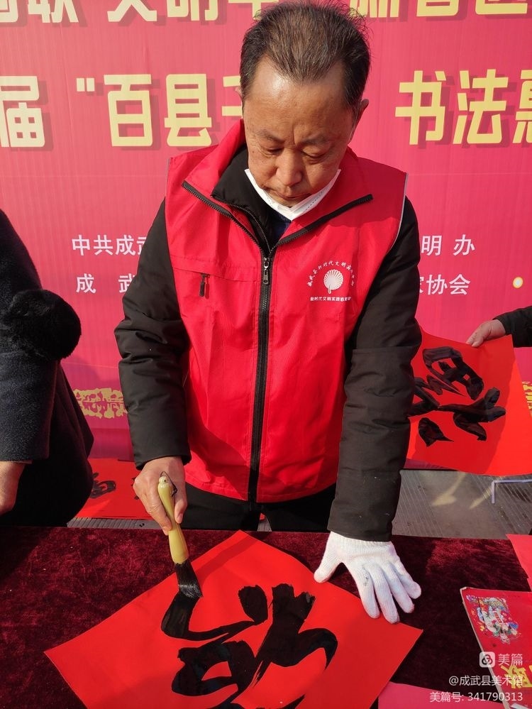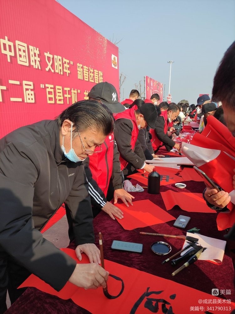 为营造吉祥如意的春节氛围,弘扬向上向善的道德风尚,把吉祥祝福送到千家万户,1月8日,成武县委宣传部、文联、文化和旅游局、县美术馆、县书法家协会、伯乐书画院组织我县知名书法家到成武县蓝水湾“黄河大集“活动现场开展“联 文明年”新春送春联 暨第十二届 "百县千村" 书法惠民活动,将充满喜庆的春联、福字和新春的祝福送到群众身边,同时为我县新时代文化文明建设添色增彩。