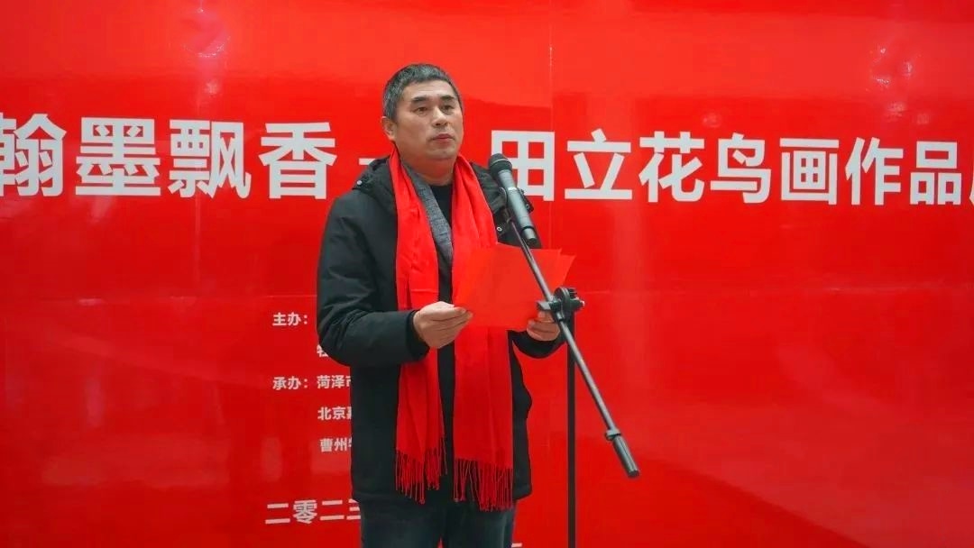 田立在活动仪式上表示,每次到曹州牡丹园,都能感受到艺术之光的明净,感受到文化之城的厚重,也感受到生态创作的,能在牡丹园办画展他感到荣幸,他说:今天展出的是我这段时间创作的一些写生作品,以牡丹为主。我一年四季在牡丹园写生,从不同角度和层面记录表现牡丹之美。这次展出的牡丹,是一种尝试,想着跳出牡丹写意的规范与框架,在色彩的运用和整体构图上寻求突破与创新,以更加抒情的方式表现牡丹的意境。尽力将个人的色彩融汇在牡丹原色之中,将自我的生命力潜藏在对牡丹生命的描绘之中,让牡丹创作回归到一种大我的境界。