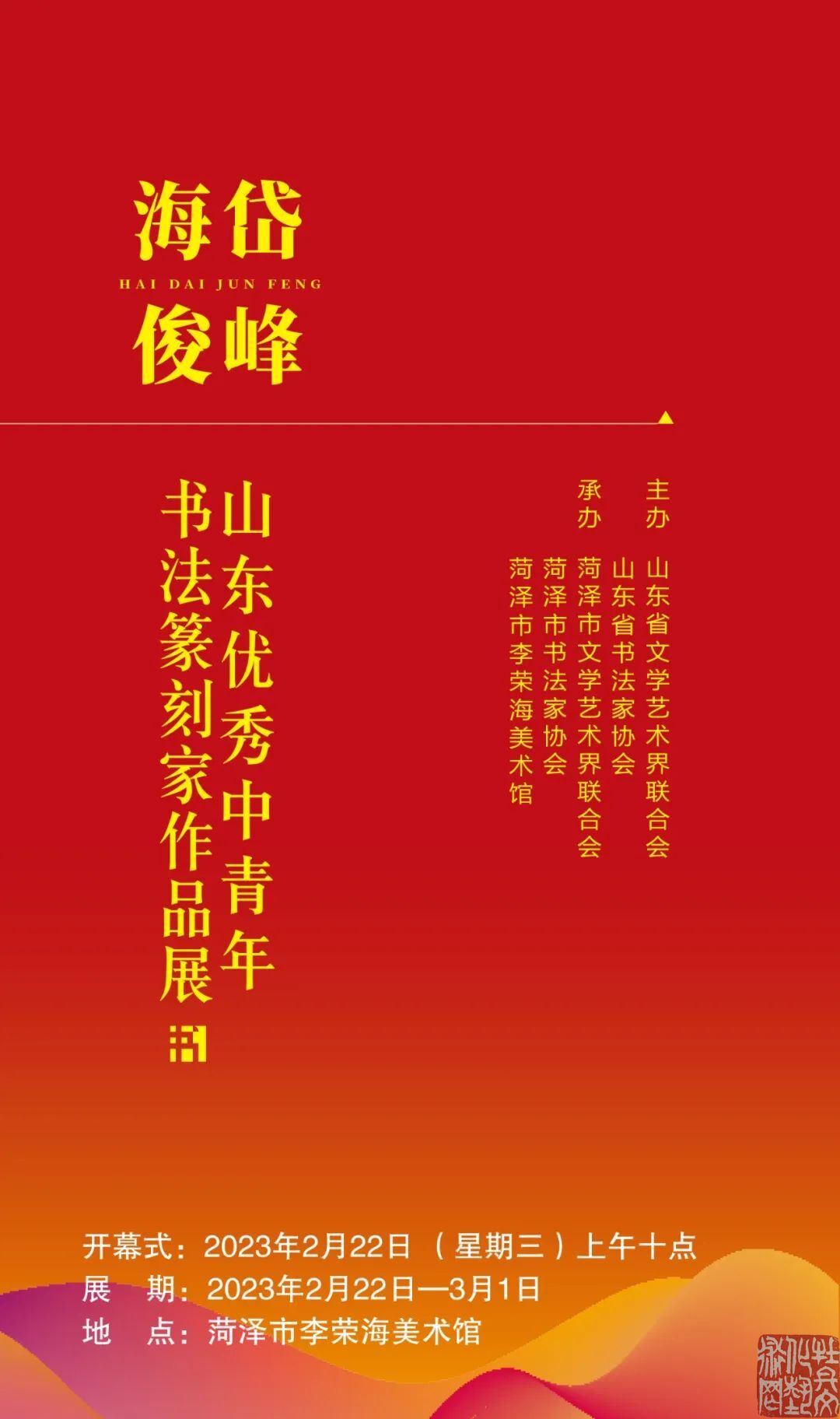 海岱俊峰•山东优秀中青年书法篆刻家作品展将于2月22日上午9:30在菏泽市李荣海美术馆开展,届时将展出67位优秀中青年书法家创作的134件书法篆刻作品。欢迎广大书法家、书法爱好者及社会各界人士莅临观展。