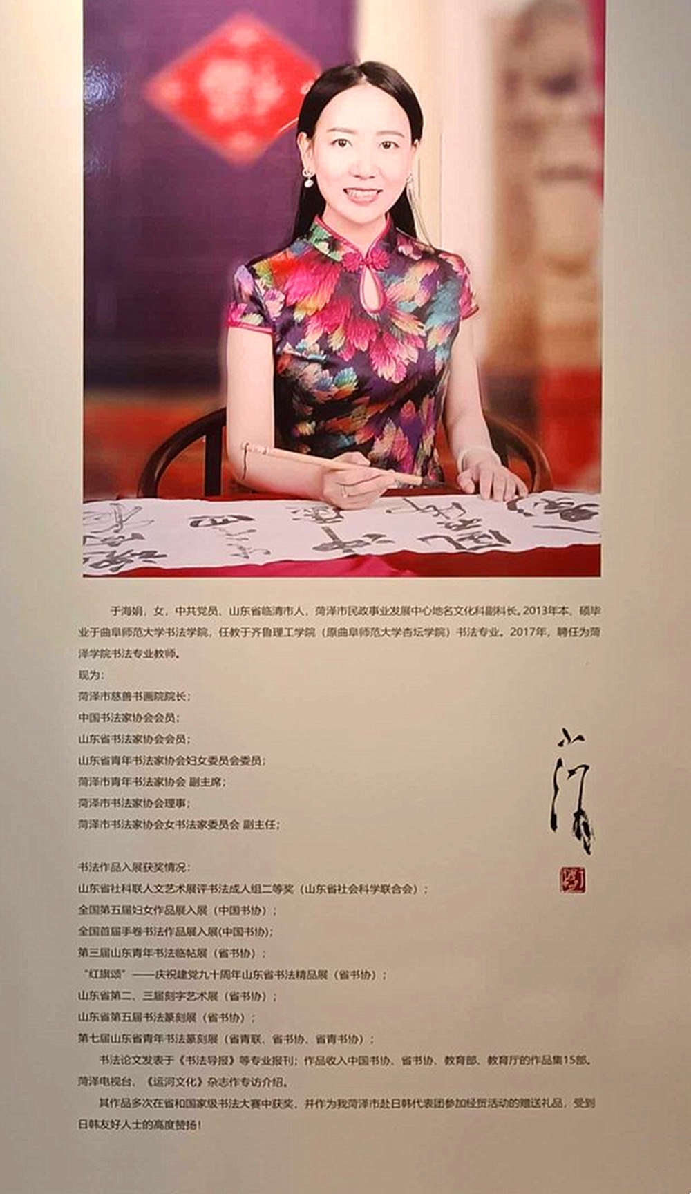 于海娟,山东省临清市人,本科、硕士均毕业于曲阜师范大学书法学院。现任菏泽市慈善书画院院长;书法家协会会员;省青年书法家协会女书法家委员会委员;菏泽市青年书法家协会副;菏泽市书协女书法家委员会副主任。其作品多次在国家和省级书法大赛中获奖,并作为我市赴日韩代表团参加经贸活动的赠礼。