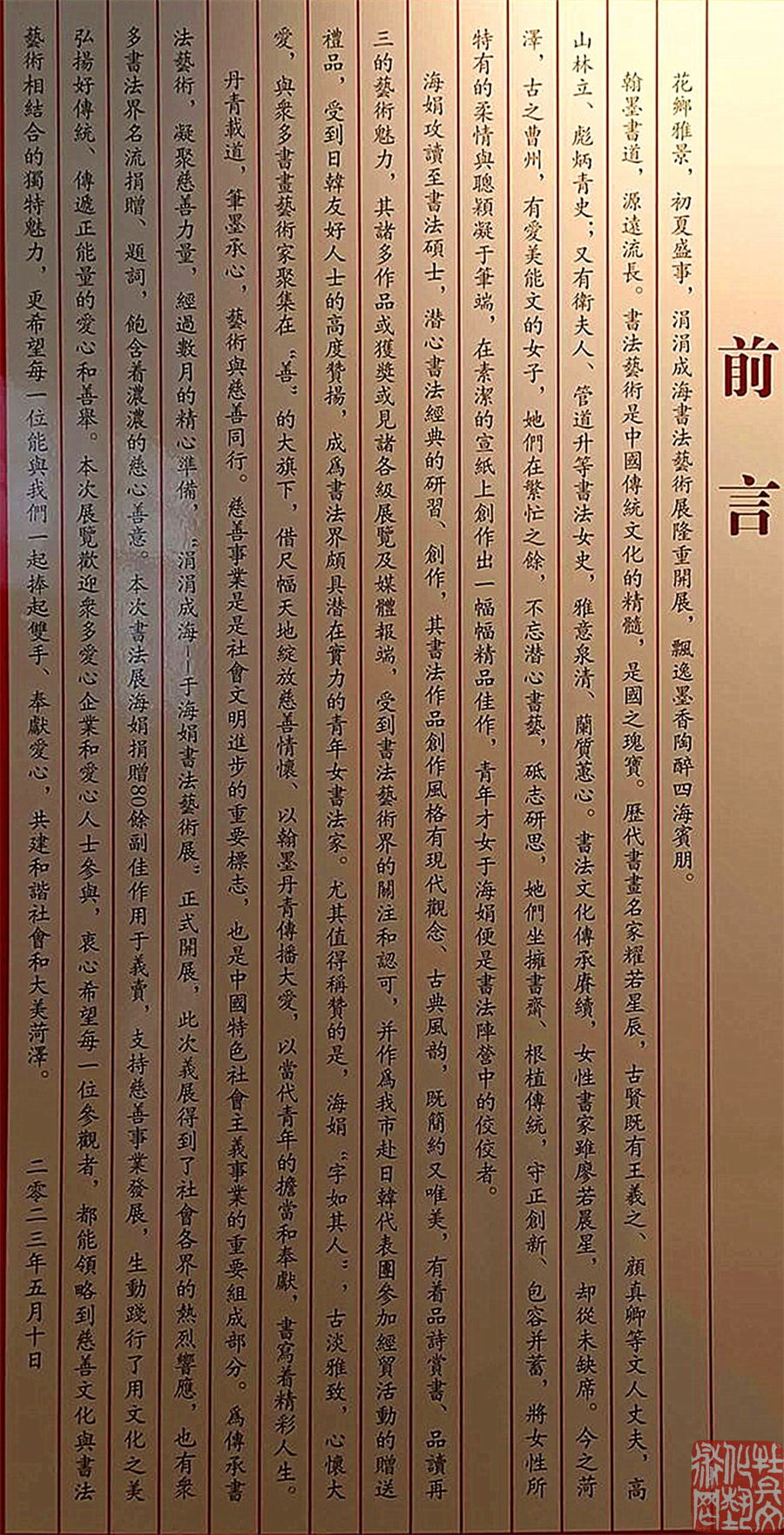 5月10日,由市民政局、市慈善总会联合主办的“涓涓成海”--于海娟书法艺术慈善捐赠展览在市博物馆开幕。