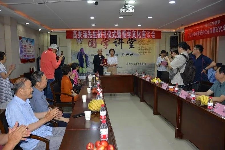 牡丹区文化和旅游局党组成员、副局长赵捷致欢迎辞,对高秉涵先生一行的到访表示热烈欢迎。高秉涵先生将自己珍藏的六种共计二十册图书无偿捐赠于牡丹区图书馆,牡丹区图书馆党支部书记、副馆长王艳英接受捐赠,牡丹区文化和旅游局党组书记、局长张丽为高秉涵先生颁发捐赠证书和牡丹区图书馆尼山书院国学教育顾问聘书。