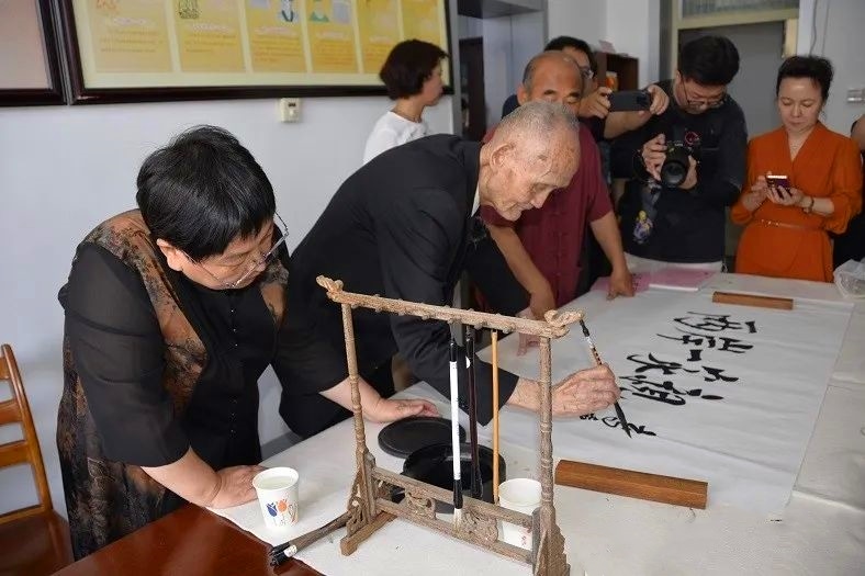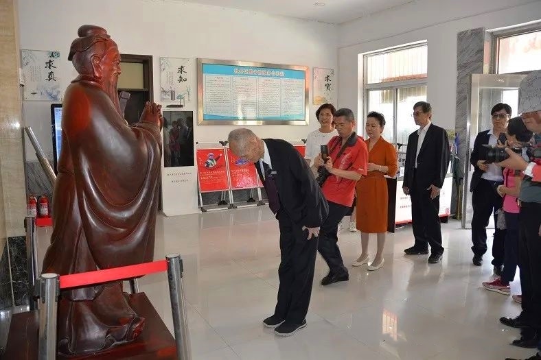 一走进牡丹区图书馆大厅,高秉涵先生面向孔子像鞠躬行礼,表达了自己对至圣先贤孔子的敬仰之情,并为牡丹区图书馆尼山书院题写了“两岸一家亲”一词。