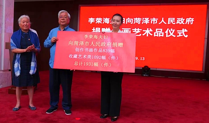 9月13日,李荣海夫妇向菏泽市人民捐赠书画艺术品仪式暨“回报家乡人民·李荣海夫妇捐赠书画作品大型回报展”开幕式在菏泽市李荣海美术馆举行。菏泽市委常委、宣传部部长周生宏主持活动。菏泽市委副书记、市长李春英向李荣海先生颁发收藏证书和“菏泽市杰出贡献艺术家”荣誉称号。菏泽市委书记张伦、中央数字电视书画频道董事局王平分别致辞,李荣海先生作了发言。山东省人大常委会原副主任齐涛宣布展览开幕。