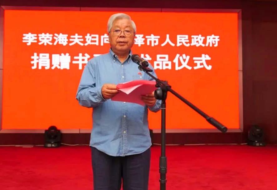 张伦在致辞中评价:“李荣海先生再次回馈家乡,将毕生创作和收藏的书画艺术精品无偿捐赠,展现了一名老党员无私奉献、回报社会的高尚情怀,展现了一名艺术家德艺双馨、高风亮节的坦荡胸怀,展现了一名菏泽儿女热爱家乡、心系故土的拳拳之情。”