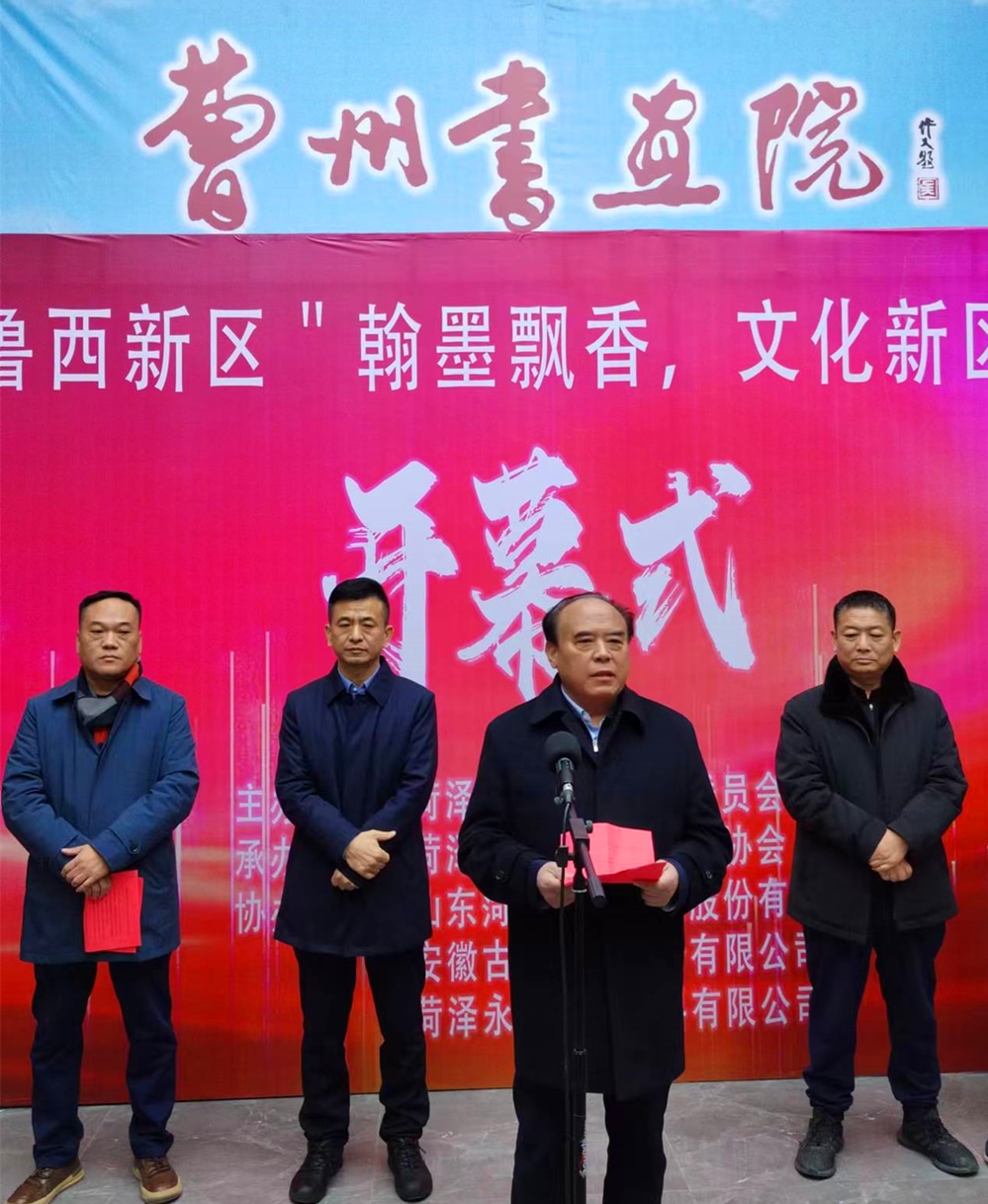 丹青雅韵,翰墨飘香。12月20日,菏泽鲁西新区“翰墨飘香 文化新区” 迎新年贺元旦“首届书画作品展”在曹州书画院开幕。菏泽市人大原副主任丁志刚讲话,鲁西新区管委会副主任、文化卫生服务中心主任 孔鲁民,鲁西新区美术家协会张瑞华分别致辞。本届书画展,由鲁西新区管委会主办,鲁西新区美术家协会协办,共展出160余幅作品,既有特邀的名家作品,也有在本次展览中获奖的数幅作品,更有鲁西新区美术家协会团的创作作品。作品包括山水画、人物画、花鸟画、书法等。这些作品,一笔一画,一草一木,一景一物,都渗透着作者对书画艺术的深刻认知和对传统艺术的深刻感悟,寄托着艺术家对生活的美好向往。这些精品力作,弘扬了菏泽鲁西新区的中华优秀传统文化,促进了书画与经典文化的融合,让广大书画爱好者共同感受着传统文化的魅力,视觉上受到强烈的冲击,艺术上受到美的熏陶,传递的是鲁西新区踔厉奋发、积极向上的正能量。
