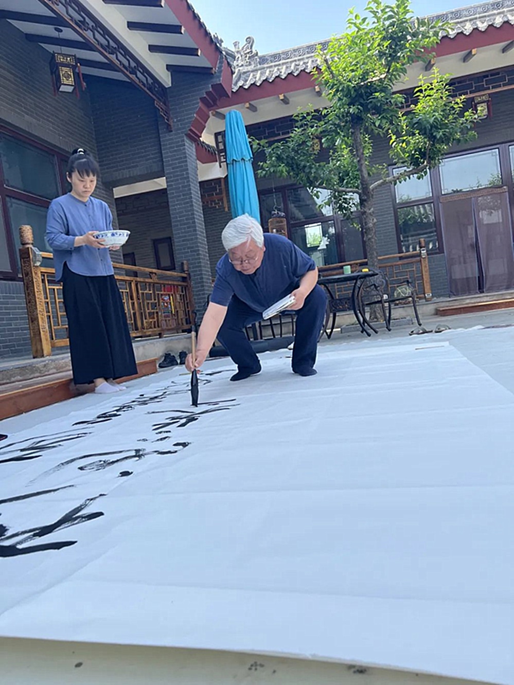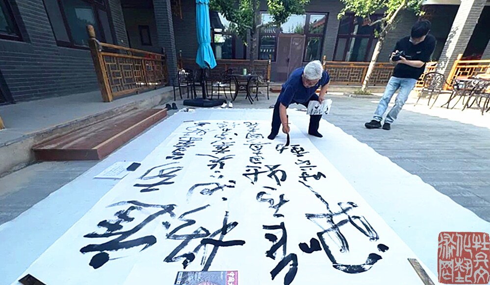 书画家李荣海先生七十六岁高龄创作巨幅书法作品刘禹锡诗《赏牡丹》,诗文:“庭前芍药妖无格,池上芙