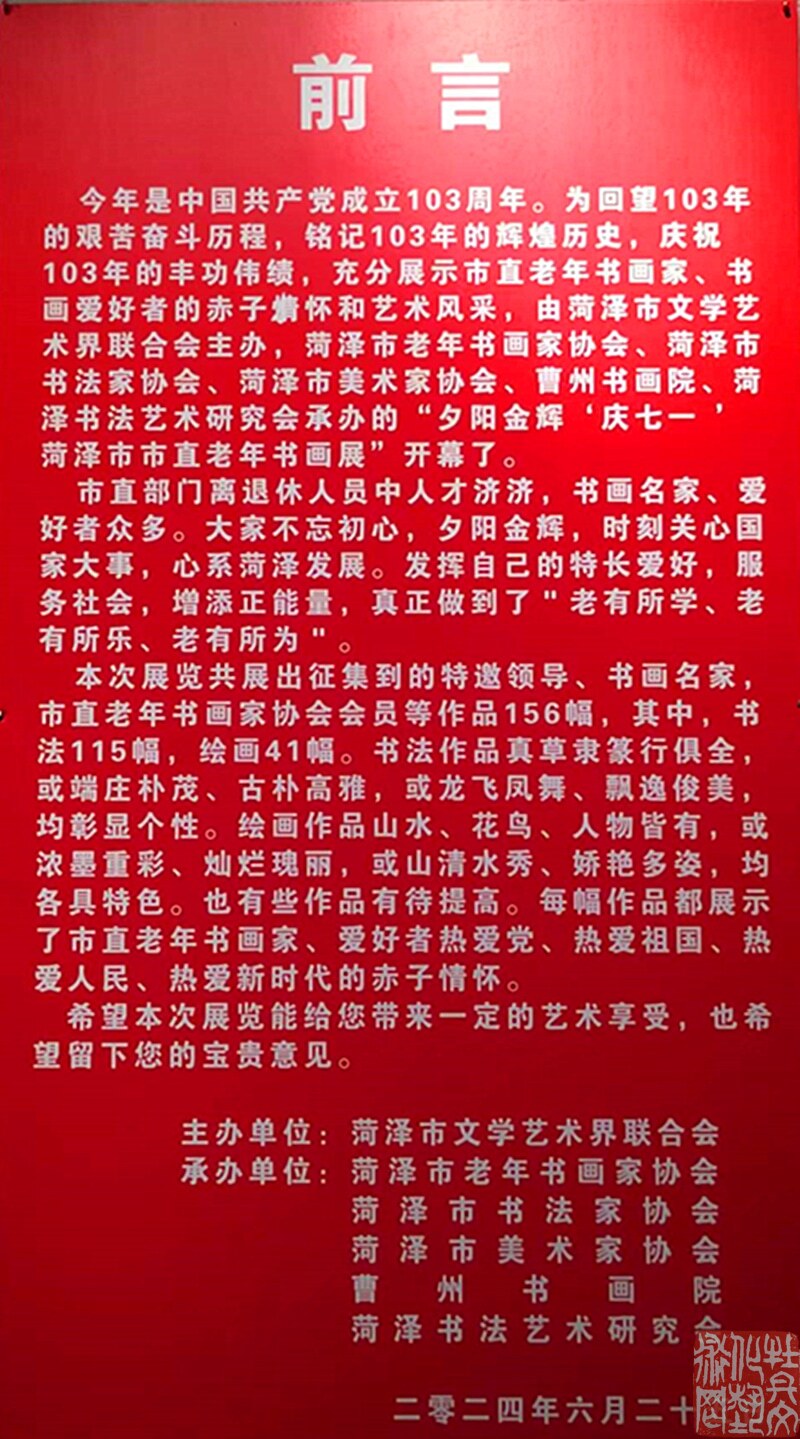 市直部门离退休人员人才济济,书画名家、爱好者众多。大家不忘初心,夕阳金辉,时刻关心国家大事,心系菏泽发展。发挥自己的特长爱好,服务社会,增添正能量,真正做到了“老有所学、老有所乐、老有所为"。
