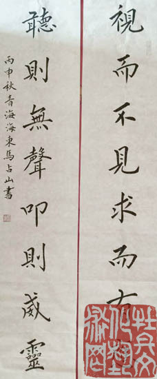 马占山,字世清,号虚行轩主人,青海省海东市平安区人,学习书法至今已二十多年,诸体皆攻,后主攻楷书,尤其对小楷和榜书大字的研究用功勤,中小楷写经书法作品被书法界同仁、收藏界人士、佛道界人士及多家博物馆等单位或个人收藏。书法作品在全国获高奖数十次,作品被民族艺术碑林、蔡伦竹海碑林等全国多处碑林刻碑上石。多年来在全国写碑多达六千多通,曾应邀给国内三百多个寺庙、书画院、酒店、餐厅及企事业单位题写匾额招牌和楹联,国际商报、青年报、书法报、青海日报、西海都市报、海东时报、海东电视台等媒体多次作专刊介绍、专访报道。