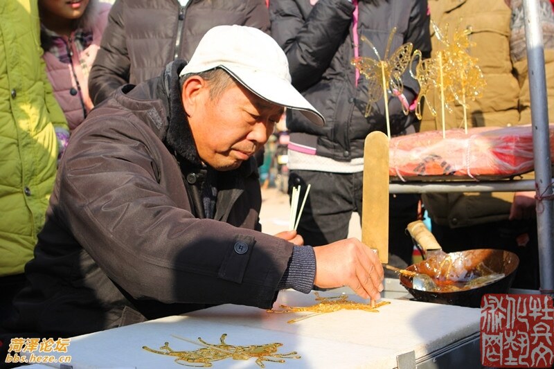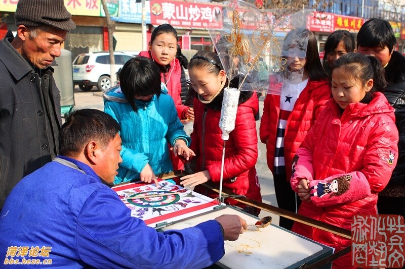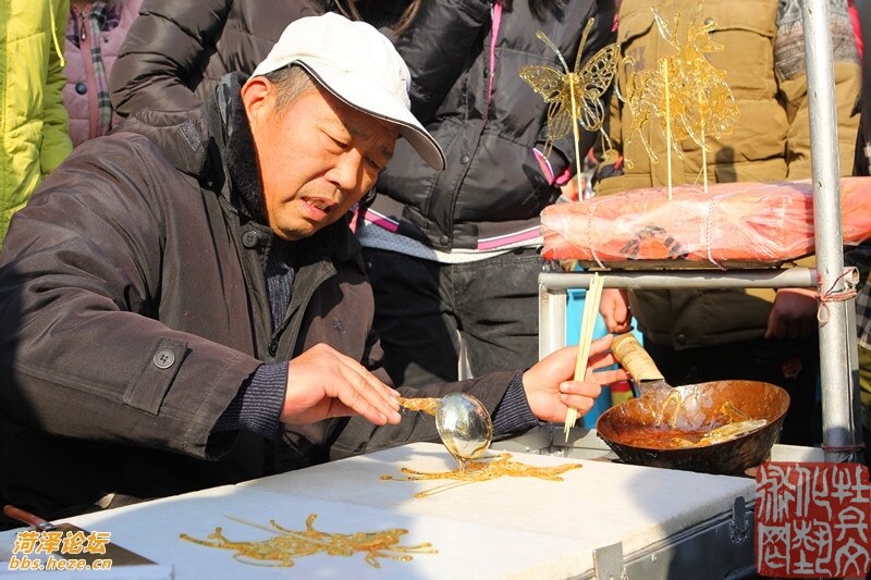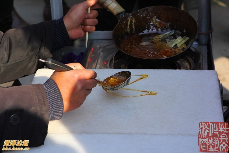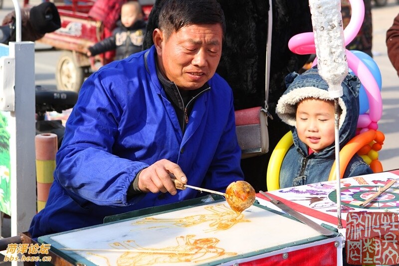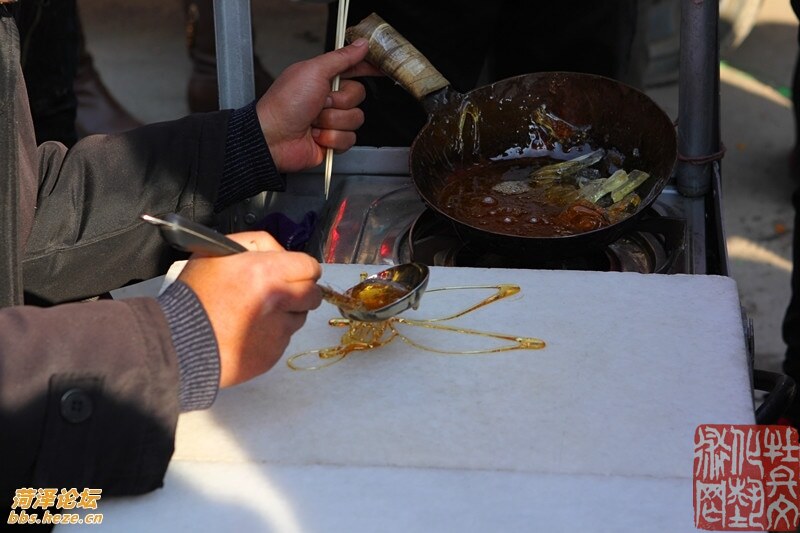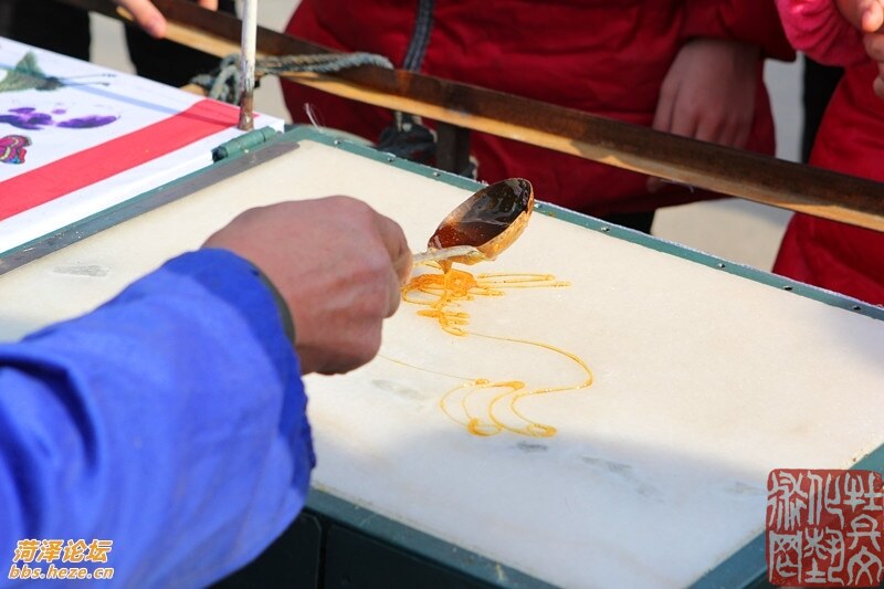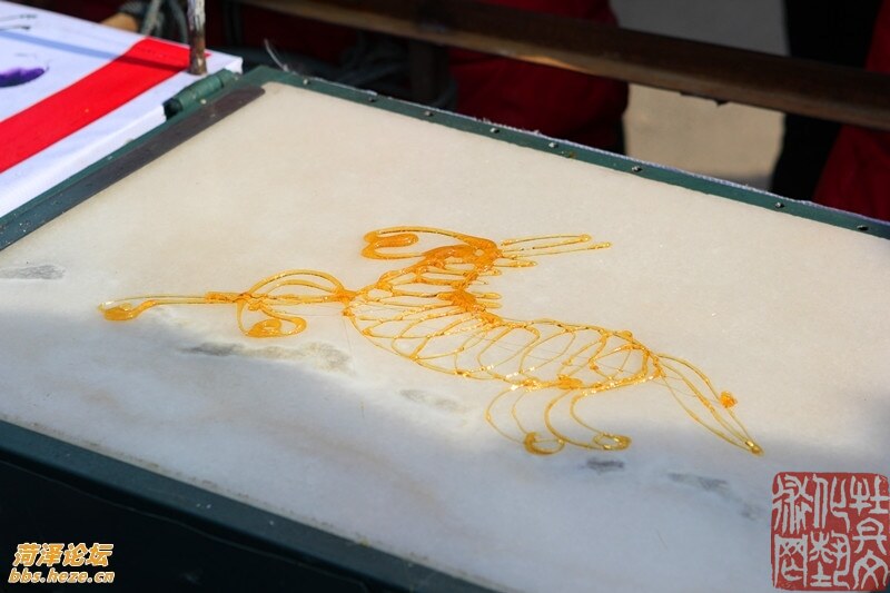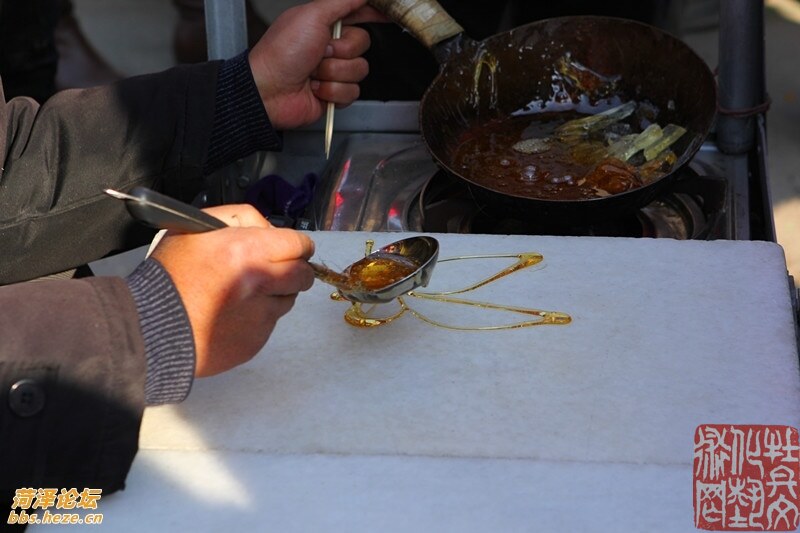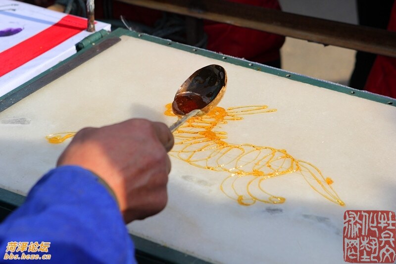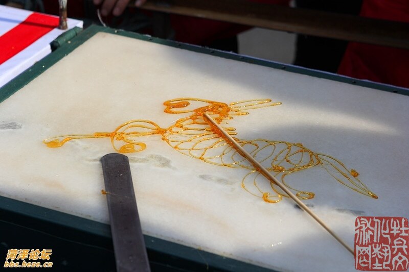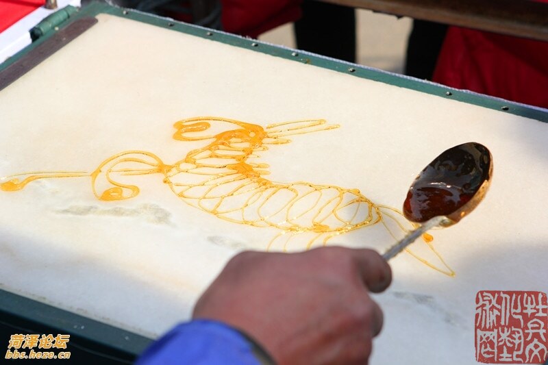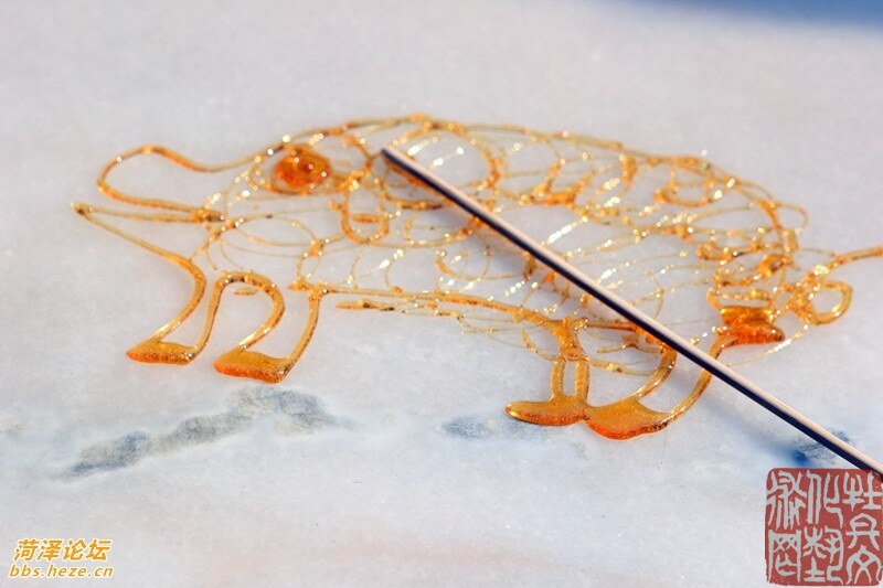熬制,熬到可以牵丝时即可以用来浇铸造型了。在绘制造型时,由艺人用小汤勺舀起溶化了的糖汁,在石板上飞快地来回浇铸,画出造型,民间艺人的手上功夫便是造型的关键。当造型完成后,随即用小