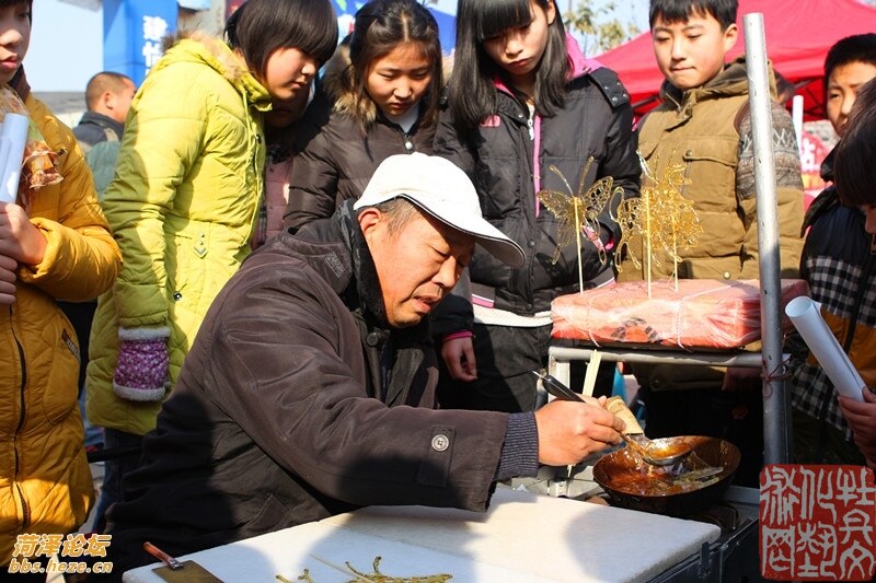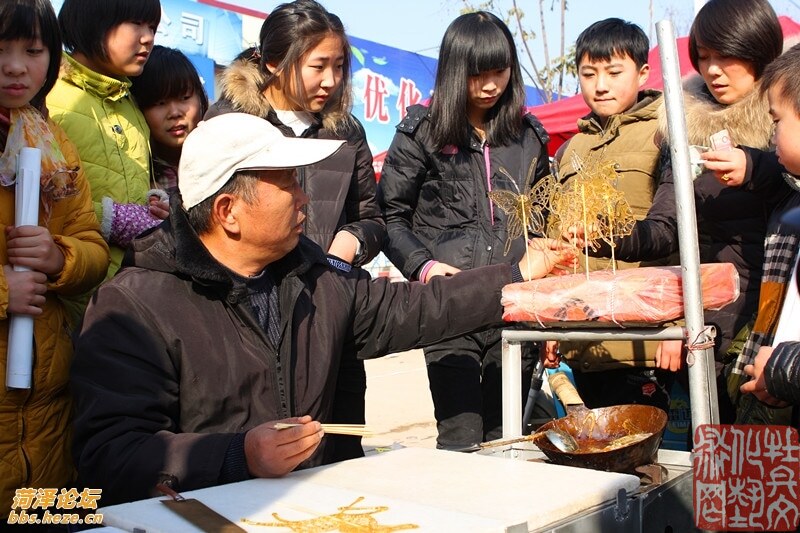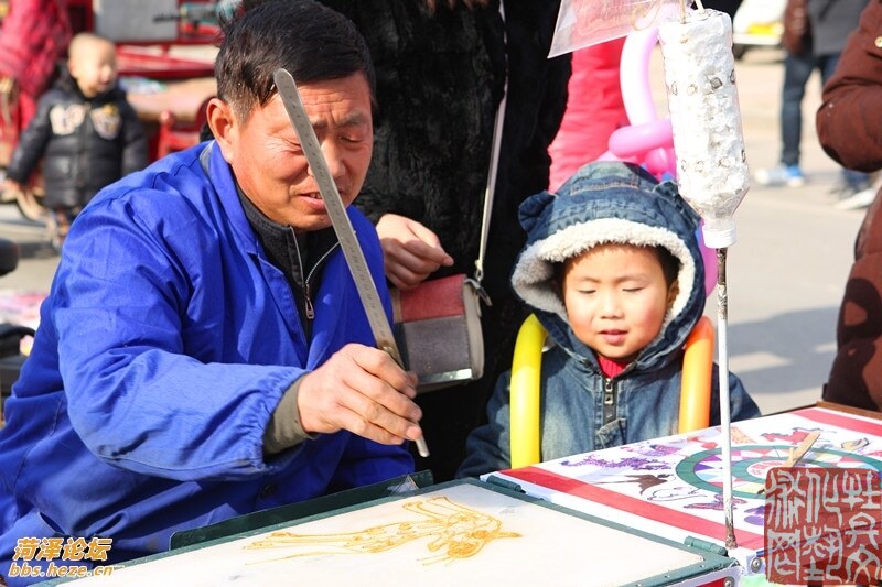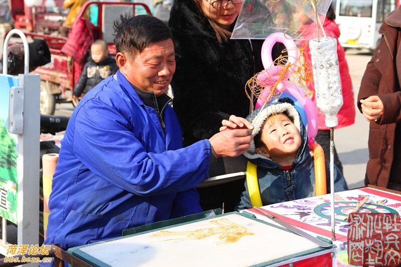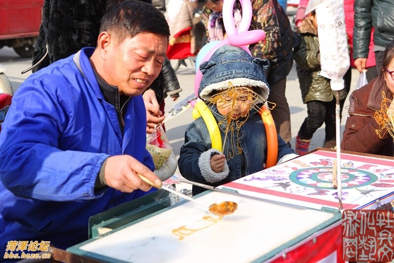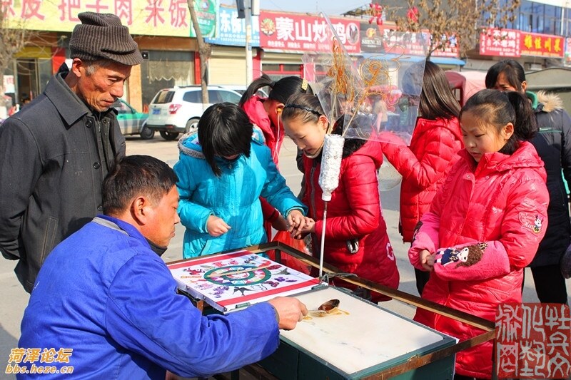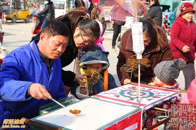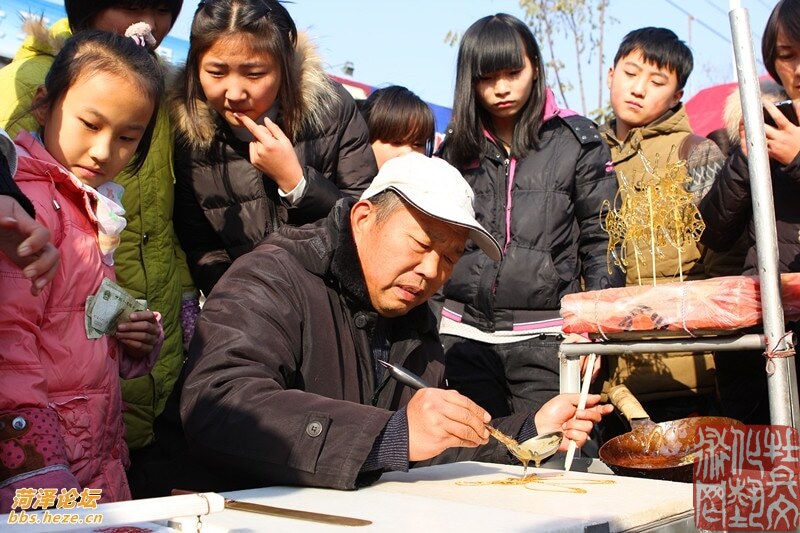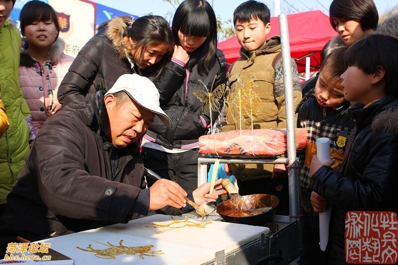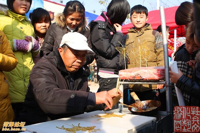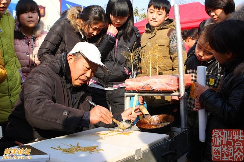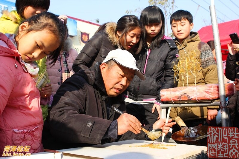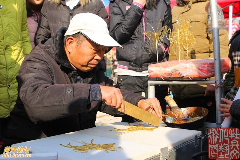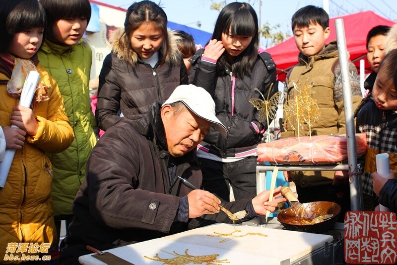 熬制,熬到可以牵丝时即可以用来浇铸造型了。在绘制造型时,由艺人用小汤勺舀起溶化了的糖汁,在石板上飞快地来回浇铸,画出造型,民间艺人的手上功夫便是造型的关键。当造型完成后,随即用小