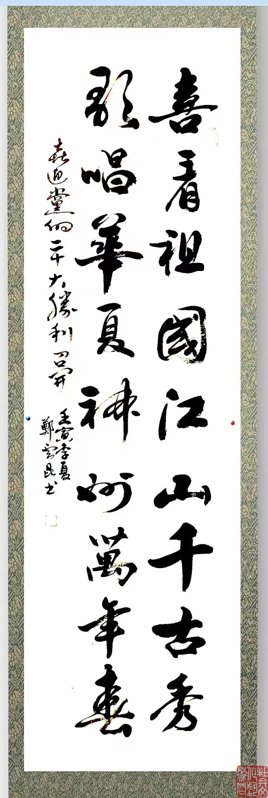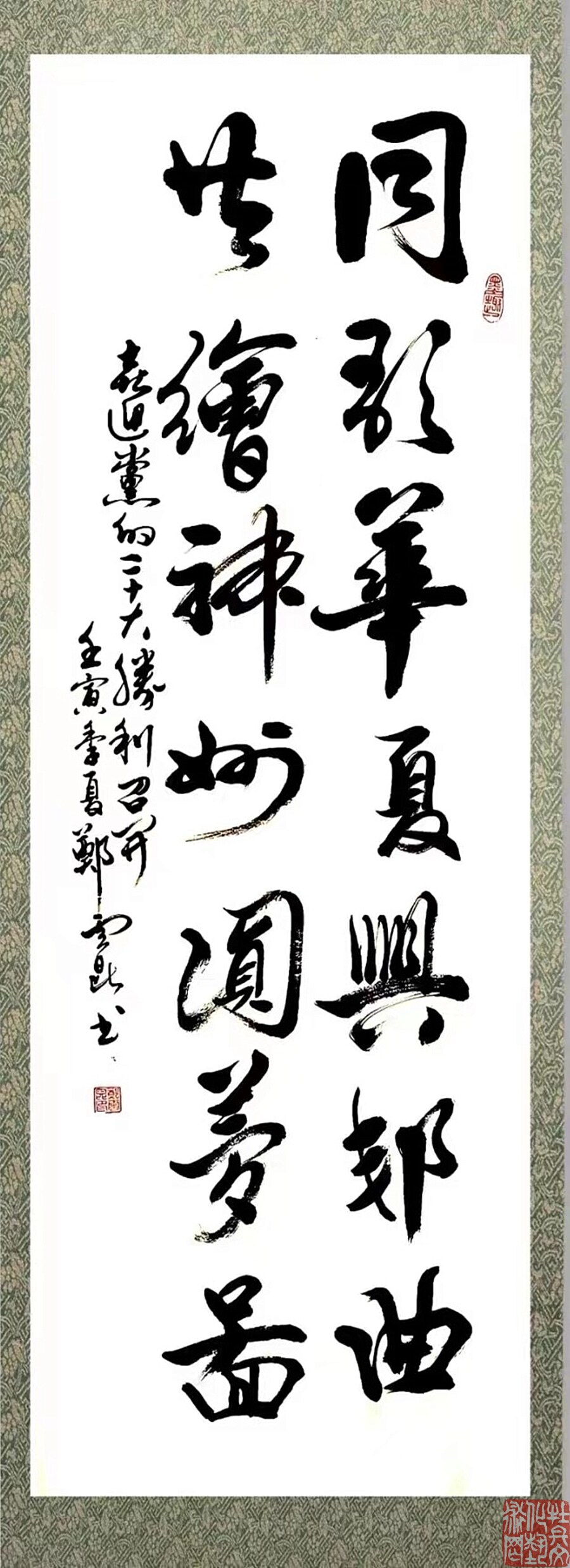每年新春佳节来临之际,郑先生都主动参加到乡镇及村庄,为群众免费书写对联、福字,近千幅作品全部送到群众手中,活动不仅为各家各户送上新春的祝福,还送去了对群众的温暖和关怀,送到了千家万户,装点了浓浓的新春气氛,增进了感情关心,传承了中华民族的传统习俗,书法知人品见心性,愿德艺双馨的郑先生继续发挥余热,充分彰显独特魅力,为社会做出更大的贡献。
