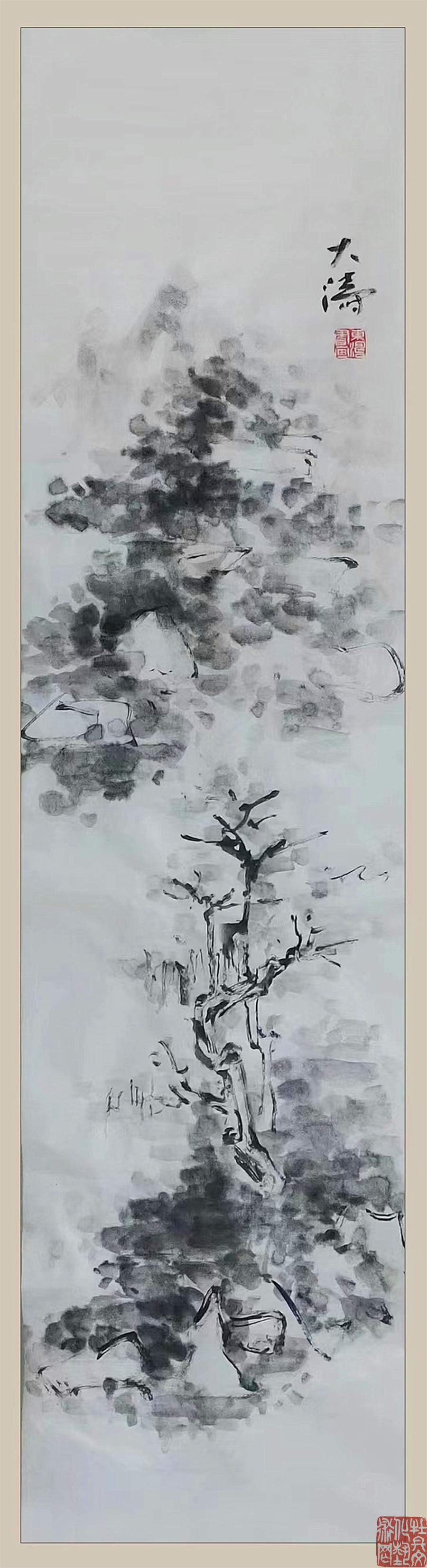大涛者,傅姓,东涛也。生于乡村,长于市井,弱冠重病,卧床三载有余,残疾于身,行动迟缓,背曲腿跛。胸无济世志,手无缚鸡之力。时至今日,因身体羸弱仍上无片瓦蔽身,下无立锥之地。而幼爱丹青,涂画不止,手追心摹。笔耕砚田多年不辍。仰望先贤,陡生敬畏,以笔为杖,举墨为纤。求索人生。不谙事世之道,虽年近半百,至今仍靠家人周济度日。仅此而已,大涛自述。