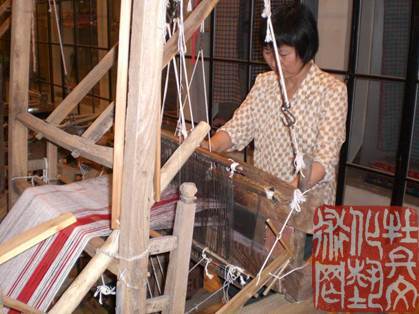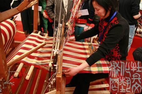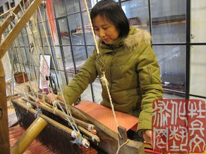 2009年2月菏泽市鄄城鲁锦艺人刘爱玉在北京农业展览馆非遗传统技艺大展上现场制作(牛玉新 摄)