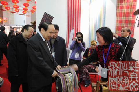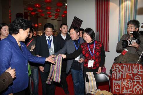 2009年2月10日 中央政治局委员国务委员参观非遗传统技艺大展菏泽市鄄城鲁锦艺人刘爱玉制品( 王丕琢摄)