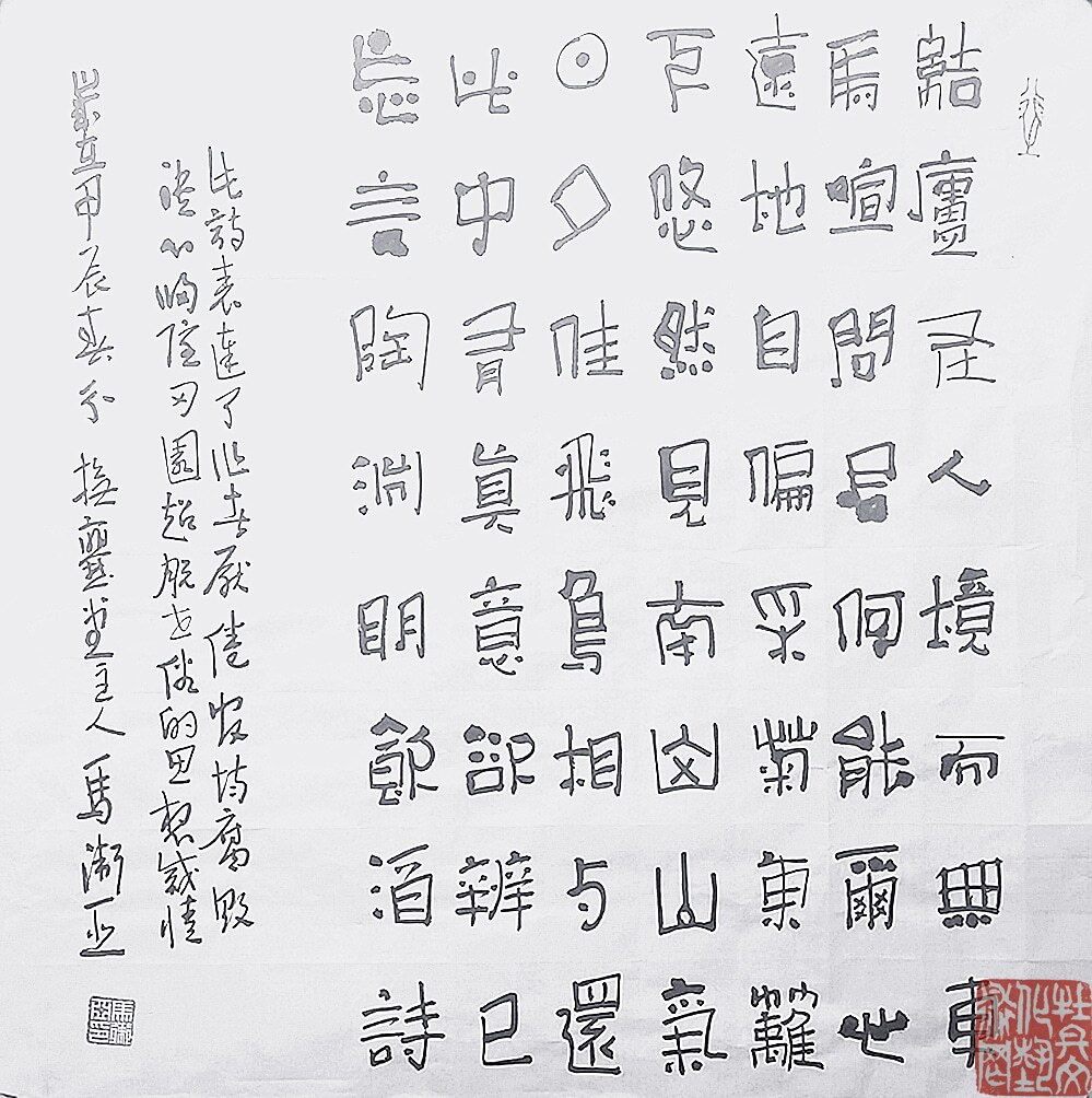 马卫亚,云南昆明人氏,出身名门书香,家学渊源厚重。数十年潜心书画研习创作。书法初入王赴,已得妍美流便,后涉隶篆,又得古樸苍辣;而用功盛者却是云南古碑之大小二爨。经年专研,于魏碑精粹《爨宝子碑》中融篆参隶杂楷,不泥古人,不随时弊,数十年积淀形成本己书风,作品极具审美格调,现为画院一级书画师,书画院云南分院秘书长,昆明市职工书画协会副会长。