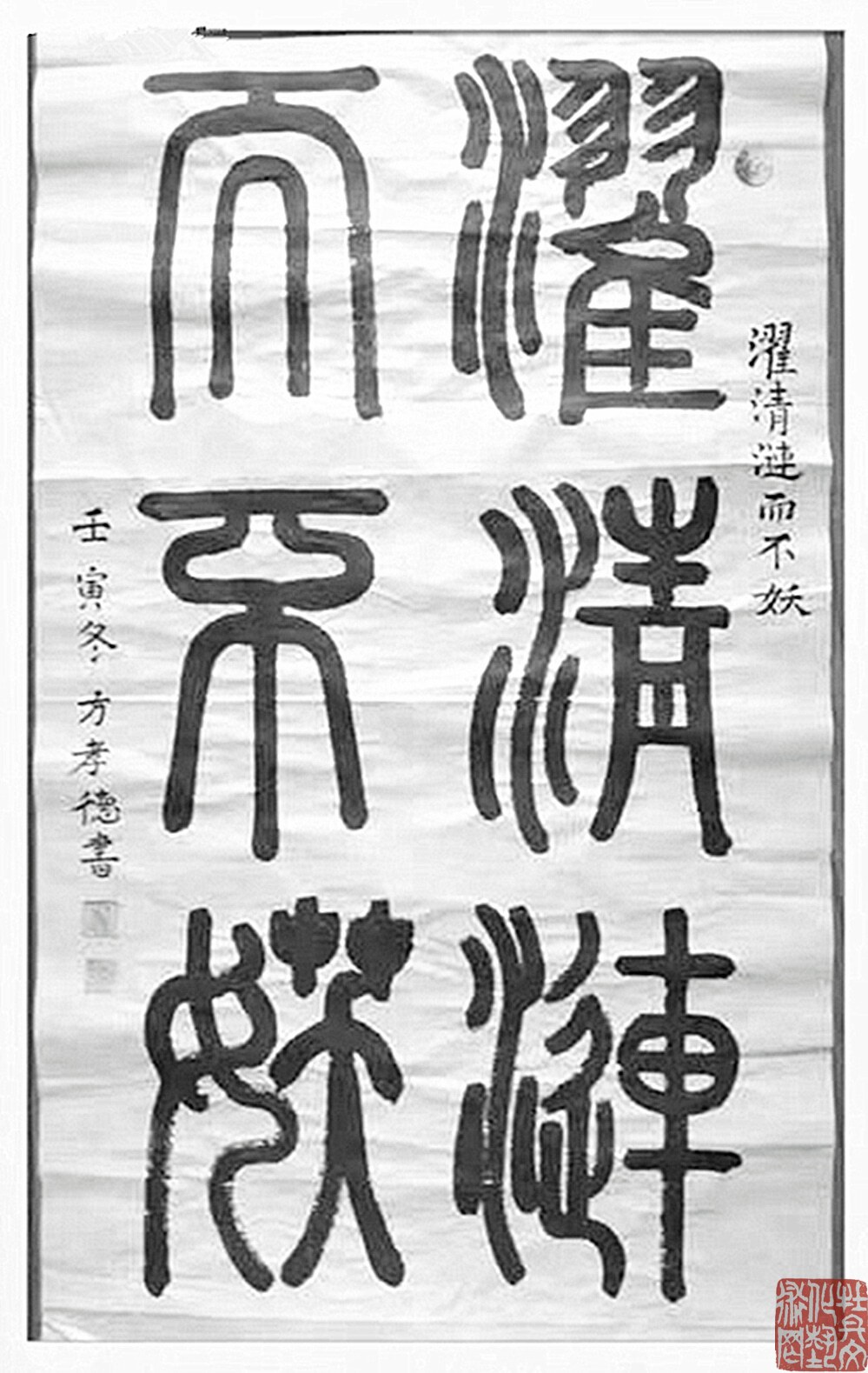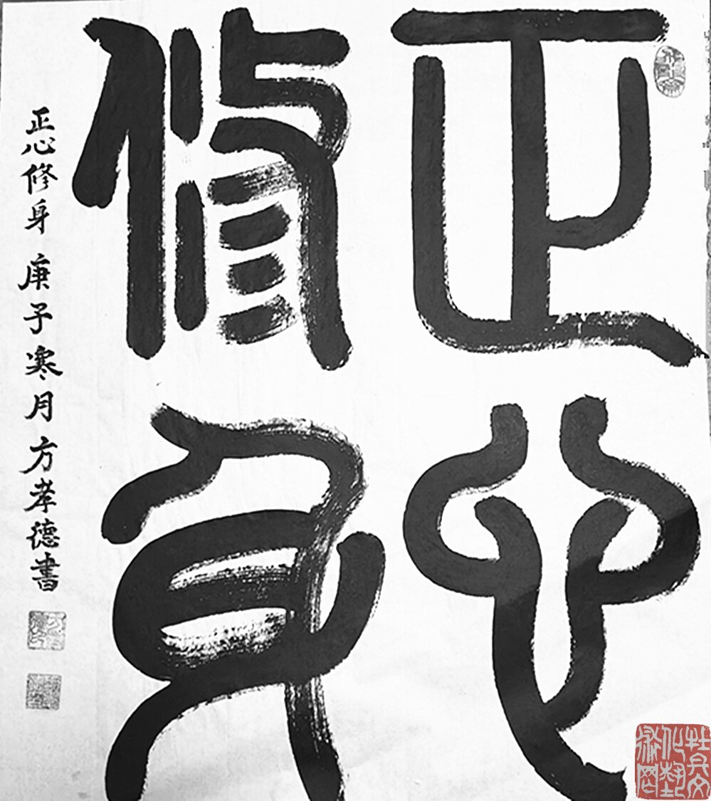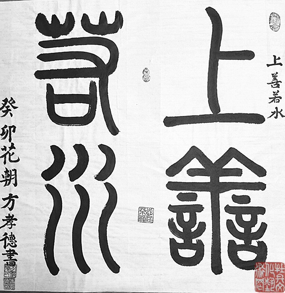 方孝德,字飞龙,内蒙古鄂尔多斯人,1960年生。从小受家父熏陶熟读四书五经热爱传统文化,现住内蒙古包头市青山区;师承古象形文字人古文字非遗传承人刘泮书先生研习古文字并在古魏国雀书(饕餮文)的研究中有所突破取得了很大的进步添补了我国这一文字研究领域内的空白;主要研习古代文字,现为文化(非遗)传承人,传统文化发展委员会副,国艺人民书画院副院长,书法家协会会员,硬笔书法家协会会员,文化高级书法师,全国人大全国政协重点推荐:人民艺术家:荣誉称号。韩国文化交流使者,新加坡文化交流大使。四十载春秋努力并且得到了罗美富.王胜利等多名书法名家的长期指导,从楷书欧颜入手遍临吏书主写篆书,笔法流畅,中正厚重,古朴不失典雅,奇拙不失雄浑,老辣不失苍潤动静相生飘逸灵活。继承发扬秦李师唐李阳冰书写特点并融入自己对文化的个性化发展理解性的创新,颇具大家风范。