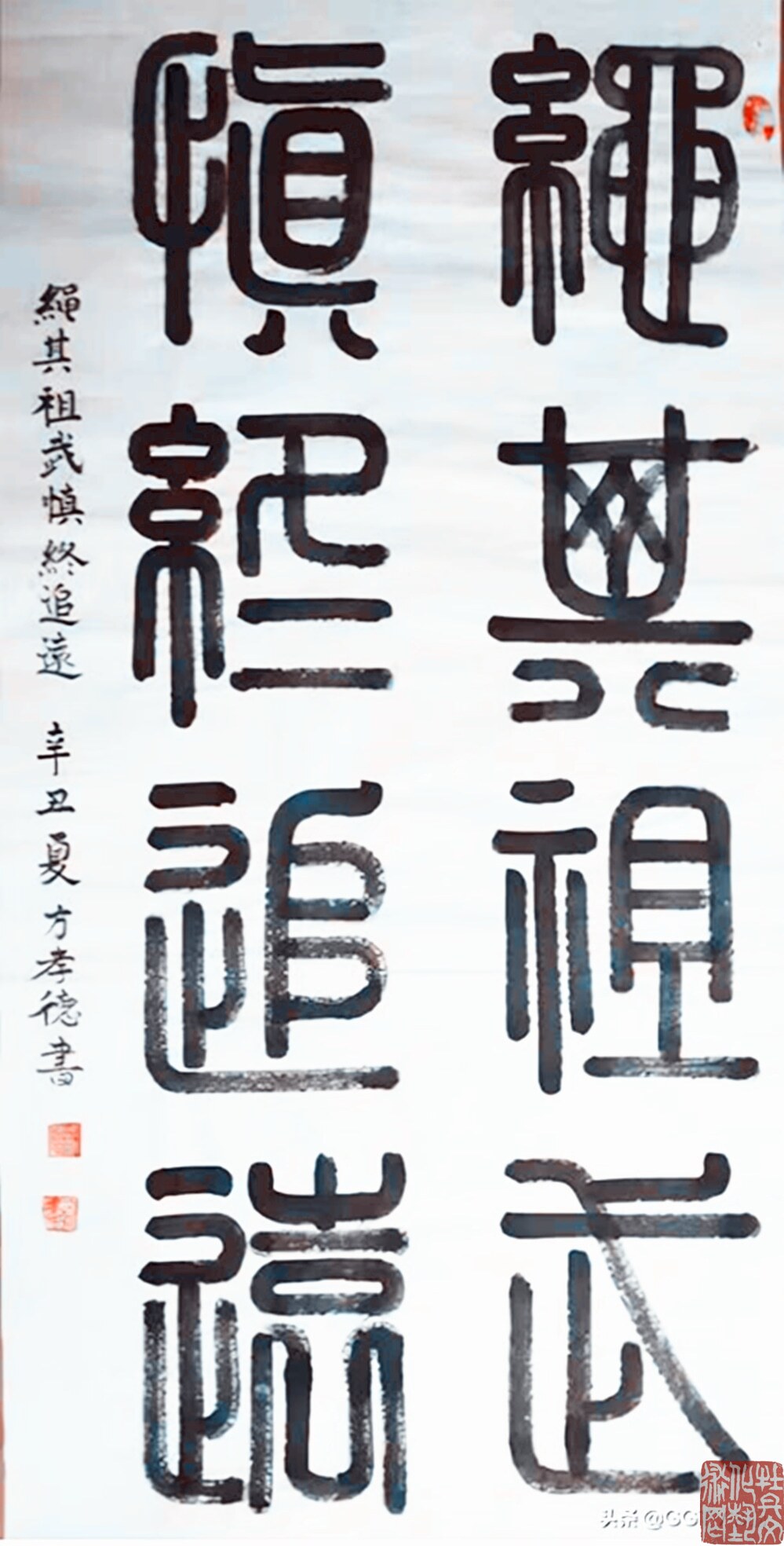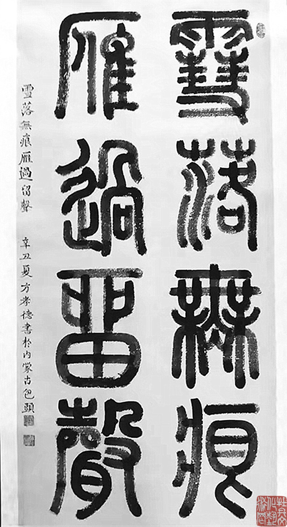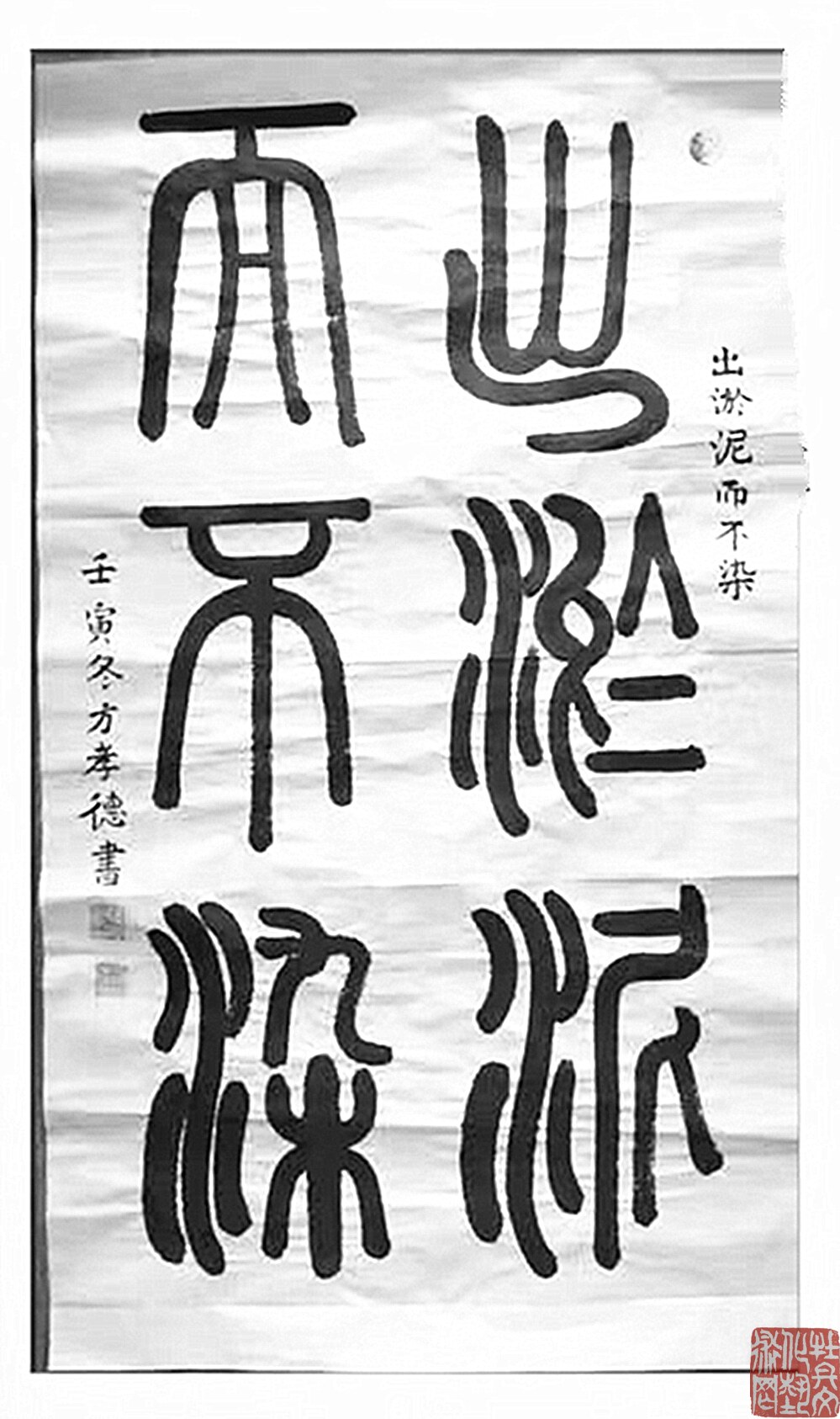 方孝德,字飞龙,内蒙古鄂尔多斯人,1960年生。从小受家父熏陶熟读四书五经热爱传统文化,现住内蒙古包头市青山区;师承古象形文字人古文字非遗传承人刘泮书先生研习古文字并在古魏国雀书(饕餮文)的研究中有所突破取得了很大的进步添补了我国这一文字研究领域内的空白;主要研习古代文字,现为文化(非遗)传承人,传统文化发展委员会副,国艺人民书画院副院长,书法家协会会员,硬笔书法家协会会员,文化高级书法师,全国人大全国政协重点推荐:人民艺术家:荣誉称号。韩国文化交流使者,新加坡文化交流大使。四十载春秋努力并且得到了罗美富.王胜利等多名书法名家的长期指导,从楷书欧颜入手遍临吏书主写篆书,笔法流畅,中正厚重,古朴不失典雅,奇拙不失雄浑,老辣不失苍潤动静相生飘逸灵活。继承发扬秦李师唐李阳冰书写特点并融入自己对文化的个性化发展理解性的创新,颇具大家风范。