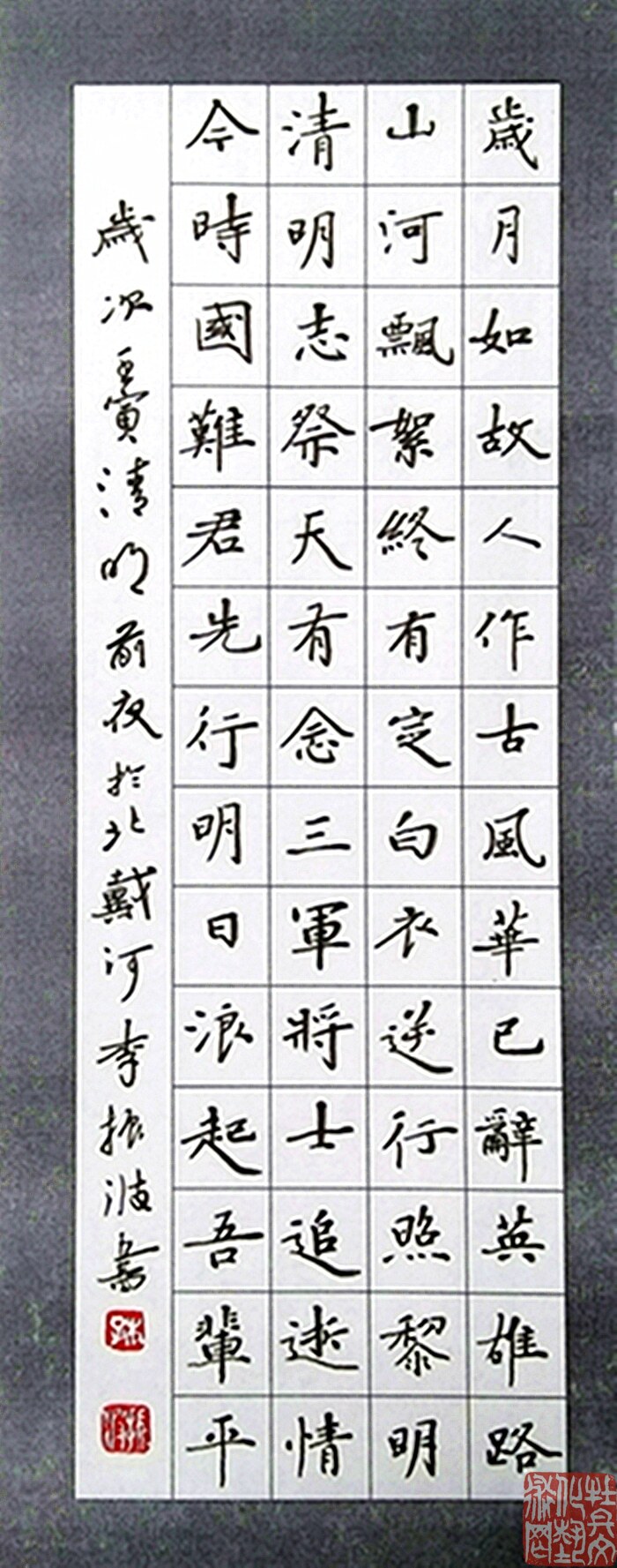 李振波,别署拜石,璞石斋主人,1966年6月出生,汉族,大学本科,中学语文高级教师,书记、校长。从事硬笔、软笔书法教学十余年。孙过庭书谱研究协会理事,北戴河书协理事,河北毛体书法家协会会员,河北硬笔协会会员,河北硬笔百强,河北省首届书法教育名师。书法作品曾多次在国家省市大赛中获奖,荣获首届八一杯文学艺术大奖赛诗书双佳一等奖,墨迹及传略入编《当代德艺俱佳书画艺术家作品精选》、《当代实力派书画家润格作品收藏大典》、《首届八一杯文学艺术大赛获奖作品集》、《纪念孙过庭1359周年全国书画大展精品集》等多部典籍;曾经《秦皇岛晚报》《秦皇岛日报》秦皇岛电视台《人物》专访报道。