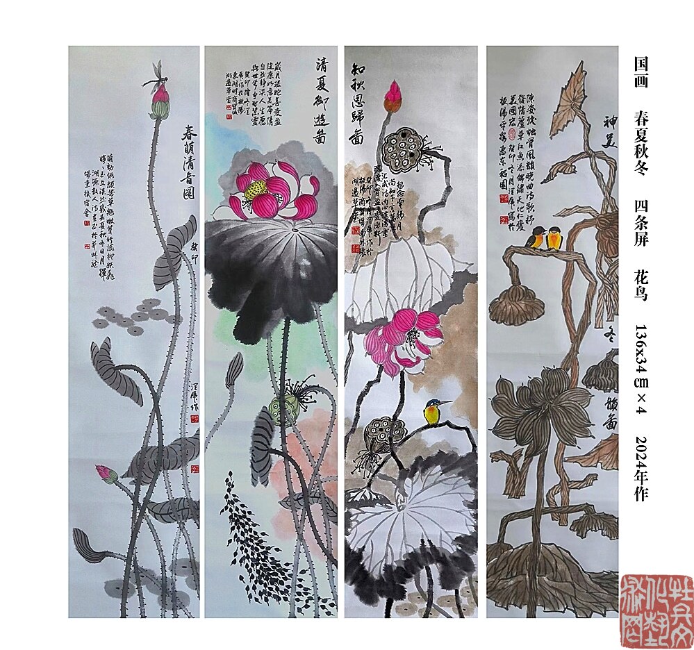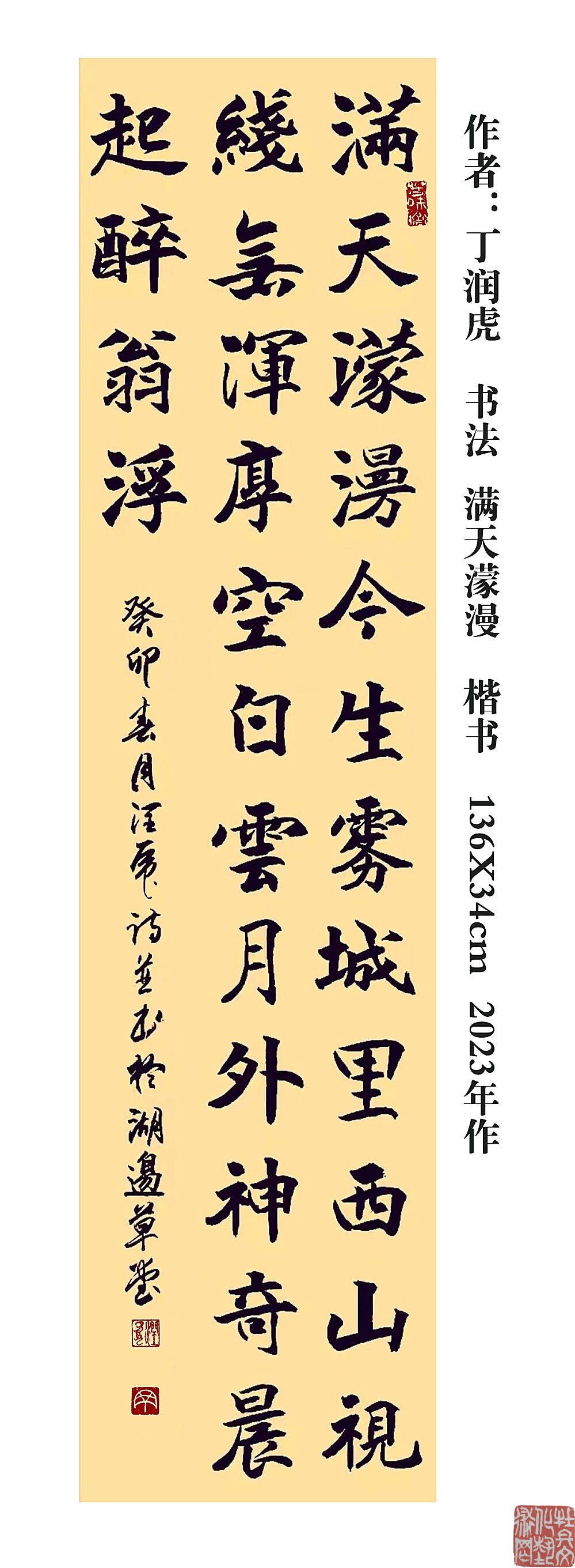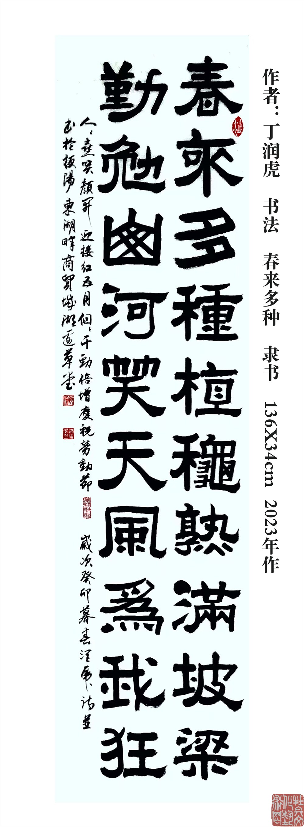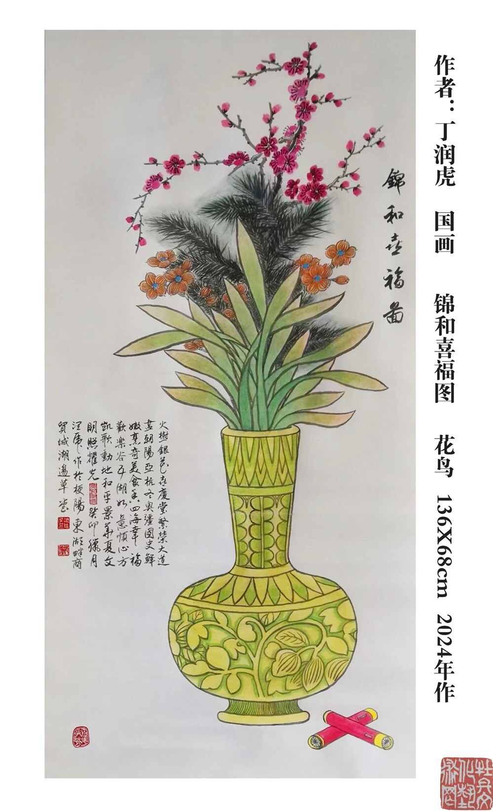 经过近四十多年的不辍耕耘,70余件次书画作品入展国内外书画大展赛,作品被编入《重阳古今墨韵吟咏汇典》 等60余册画集中;17件被“法国卢浮宫艺术博物馆”、“人民大会堂”等国内外艺术机构永久收藏,颇多被全国各地爱好者收藏。被授予“当代杰出贡献书画艺术家”等称号。应邀给“山西中科”、“山西佳美”等40多家单位书写了门牌匾额。百余首诗词格言入编到《中华好诗词好格言作品选》等十余部书中。多次在华北等地区体育舞蹈锦标赛上获拉丁舞第二等。给“山西中科”、“太原创联”等单位设计的40余枚徽商标被录用。出版有《古今名联~中华名联集国粹.青史名流存墨痕-丁润虎专辑》等多薄个人书画专刊,是一位生活充实、爱好广泛的书画艺术家。