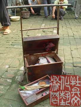 王锡金,是当地一位小有名气的江米人艺人。15岁时,他就拜师于民间艺人王勤胜学习江米人的捏制工艺。王锡金跟随师父二十余年,走遍祖国大江南北,与师傅走街串巷,靠捏制江米人卖艺为生。他们每人一付“挑子”(扁担),挑子的一头挑着耳朵锅(两边带“鼻”的小生铁锅)、碗、瓢、面盆和铺盖卷等日常生活用品,一头挑着马扎和捏制江米人的木制工具箱,箱内放有竹签、拨子、剪子、梳子等工具和预先备好的面团和几斤面粉。每到一个地方,他们就要停上几天,当街摆摊卖艺。走一地卖一地,用赚取的钱做盘缠路费和补给江米面料费,养家糊口。