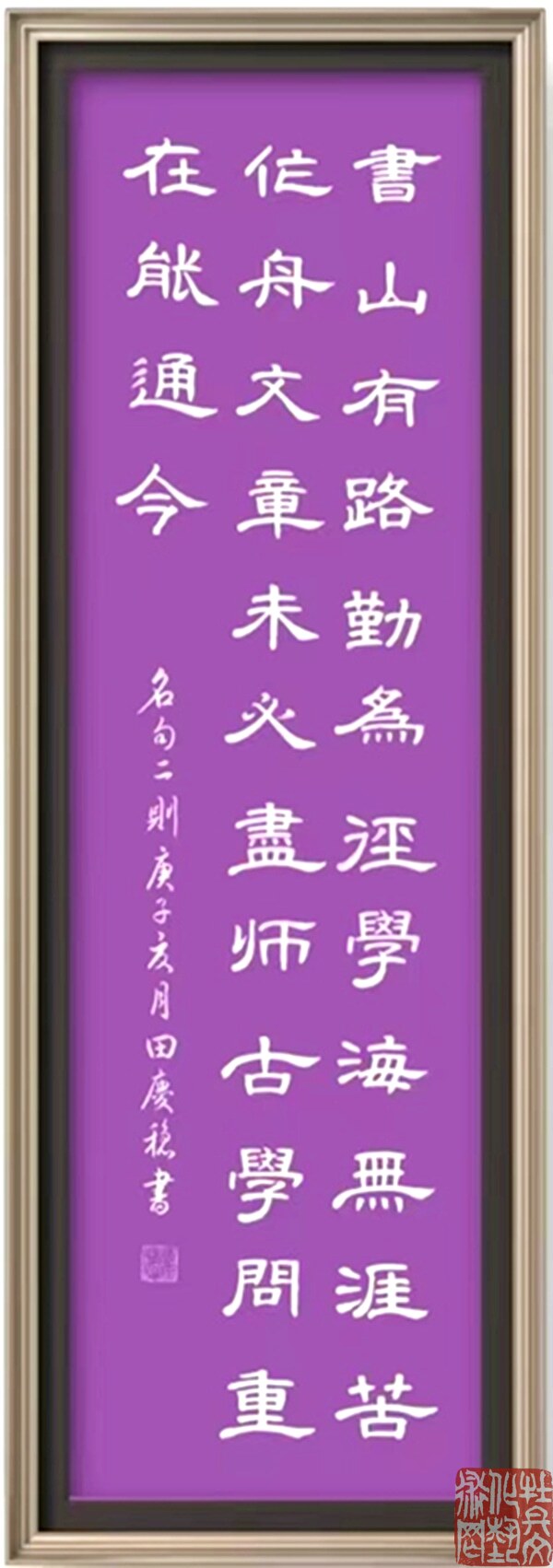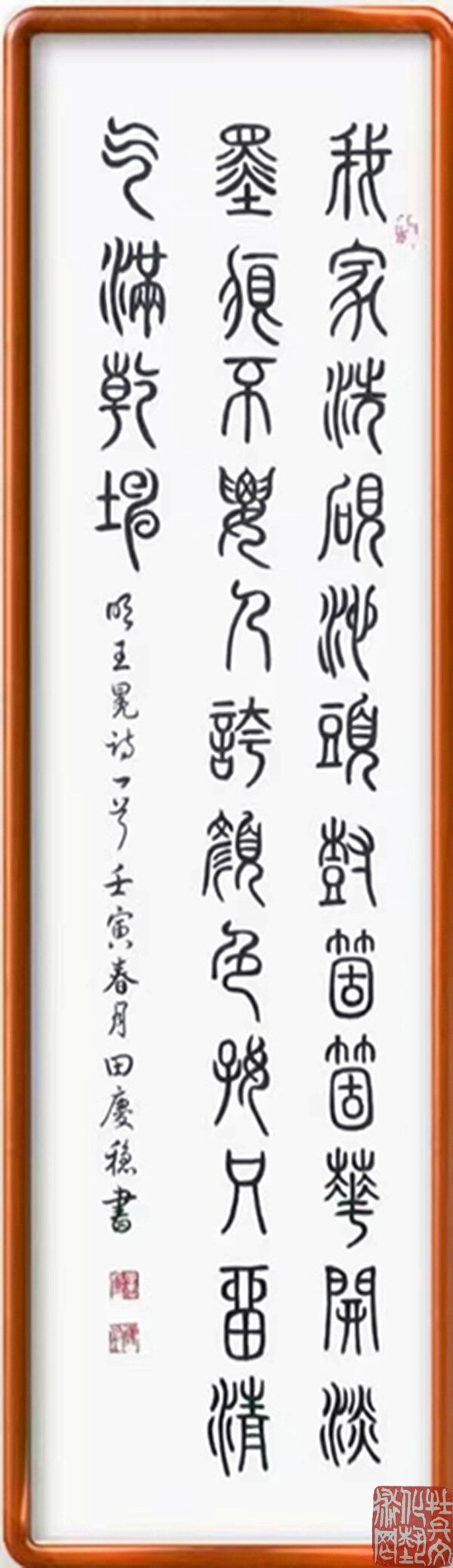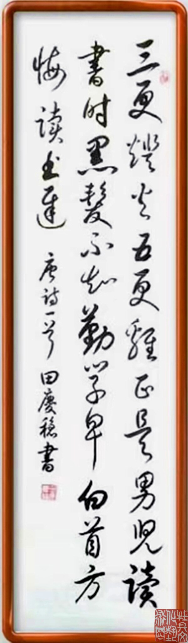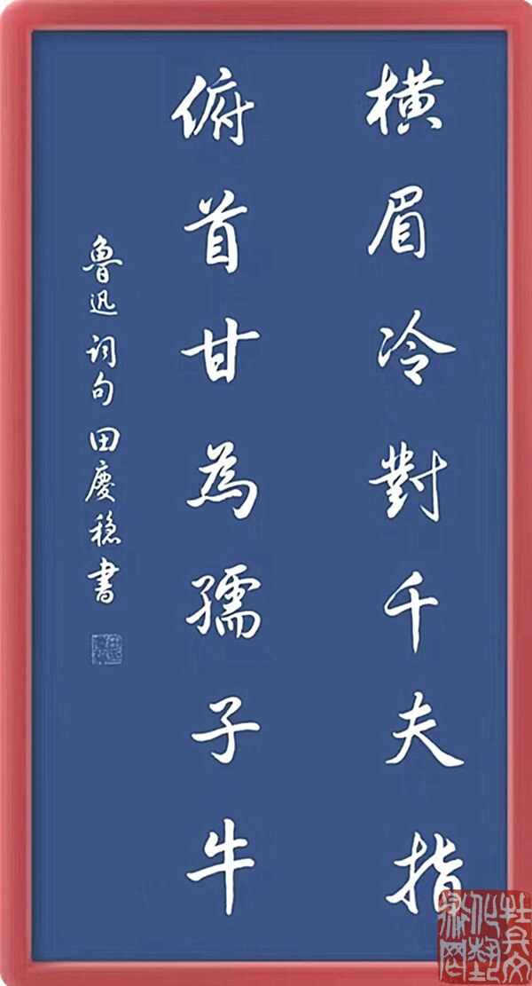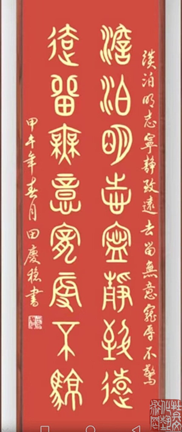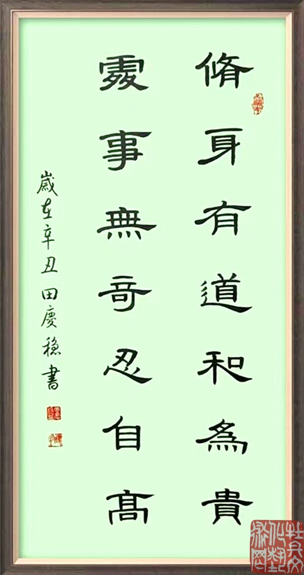 田庆稳,男,山东菏泽人,1944年2月生。自幼习书,笔耕不辍,学习刻苦认真,不断与时俱进。取法二王,学古习今,尊师教以得技法,临古帖继承传统,真、草、隶、篆、行五体皆攻,以行草见长。书艺高雅,底蕴深厚,清秀豪达,雅俗共赏,深受广大观众好评。曾多次参加全国各地书法大赛并且获奖,其中金奖就有数十次之多。