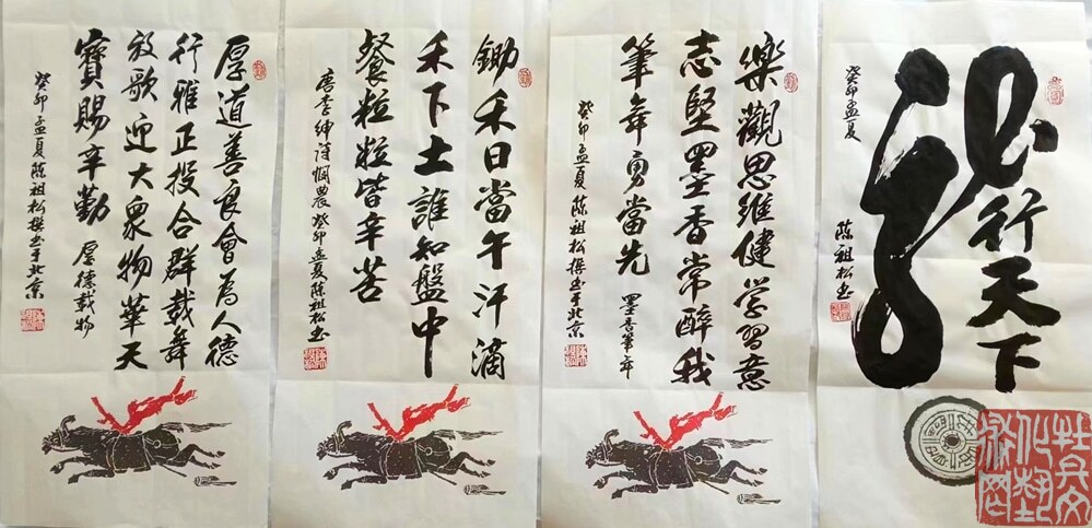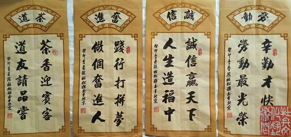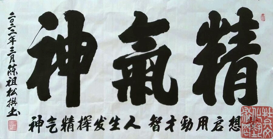 平生爱墨香,致力于书法。墨香飘万里,书法靓千家。陈祖松从事书法研究创作已超越半个世纪,初学写字就临摹名帖颜体。其习惯于写榜书,颜体粗壮之笔画正是榜书所需。虽然陈祖松练习颜体功夫尚欠到位,但其博采众长,自成一体。而陈祖松常写招牌礼匾榜书既展现颜体风骨,又独有自身风格和鲜明特点。书艺得发挥,人生不遗憾。