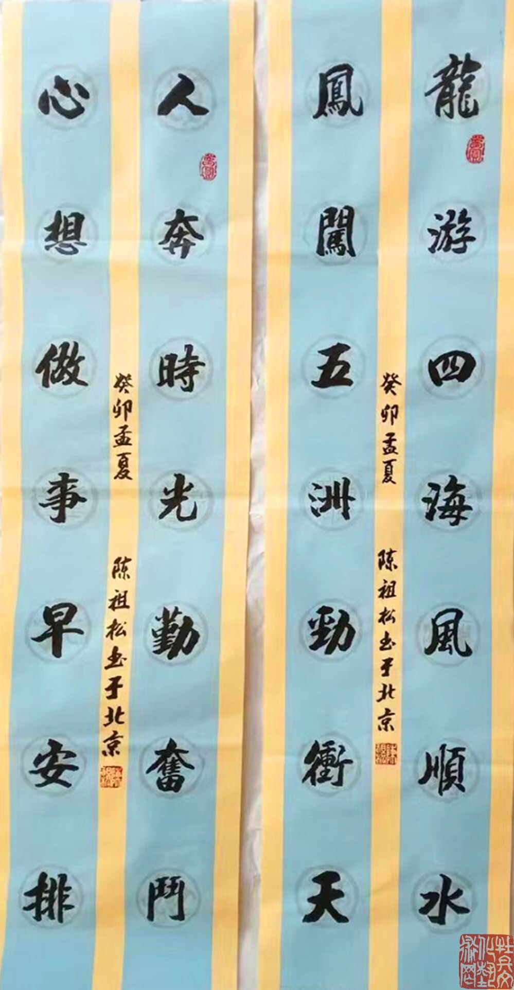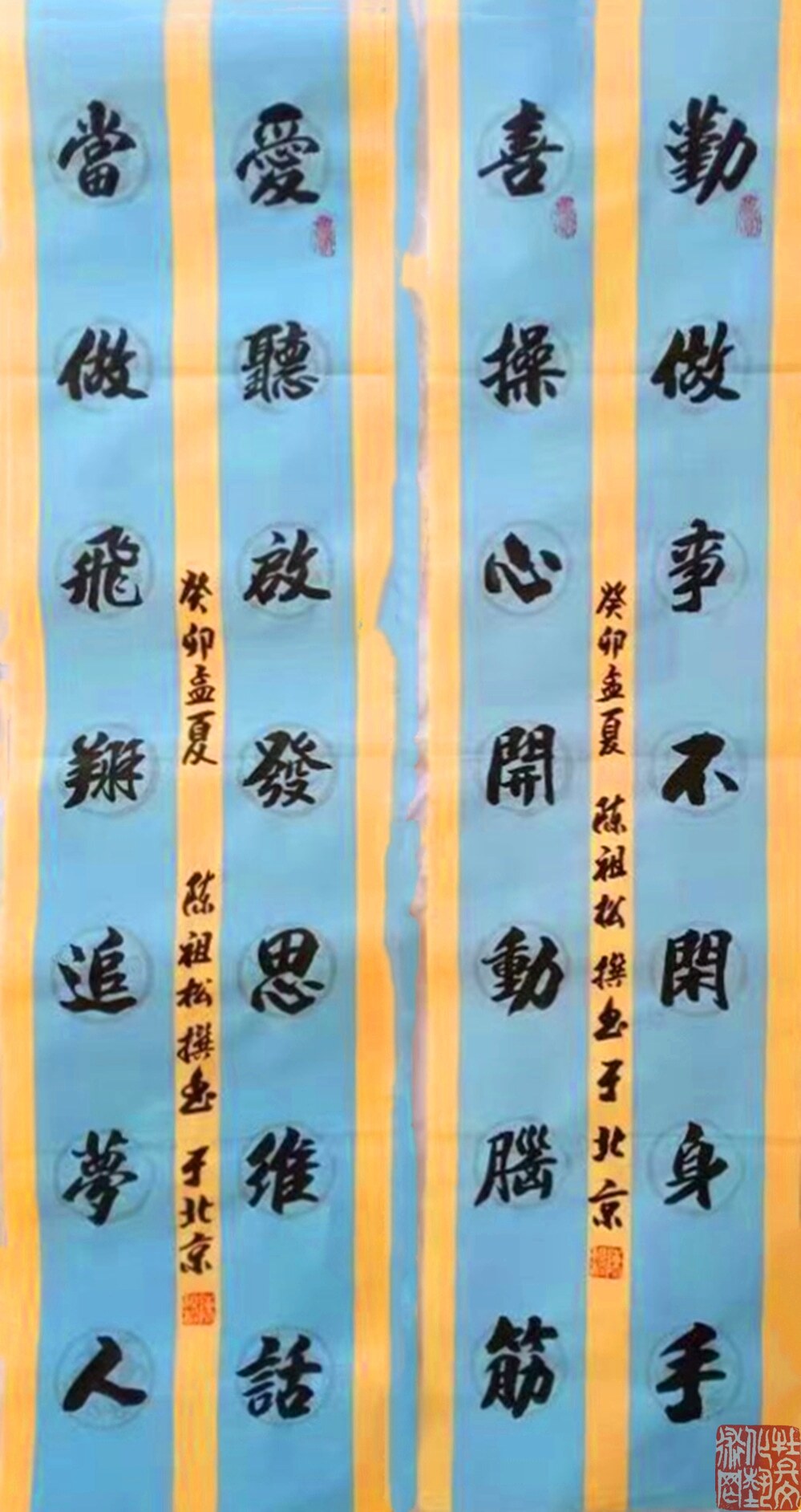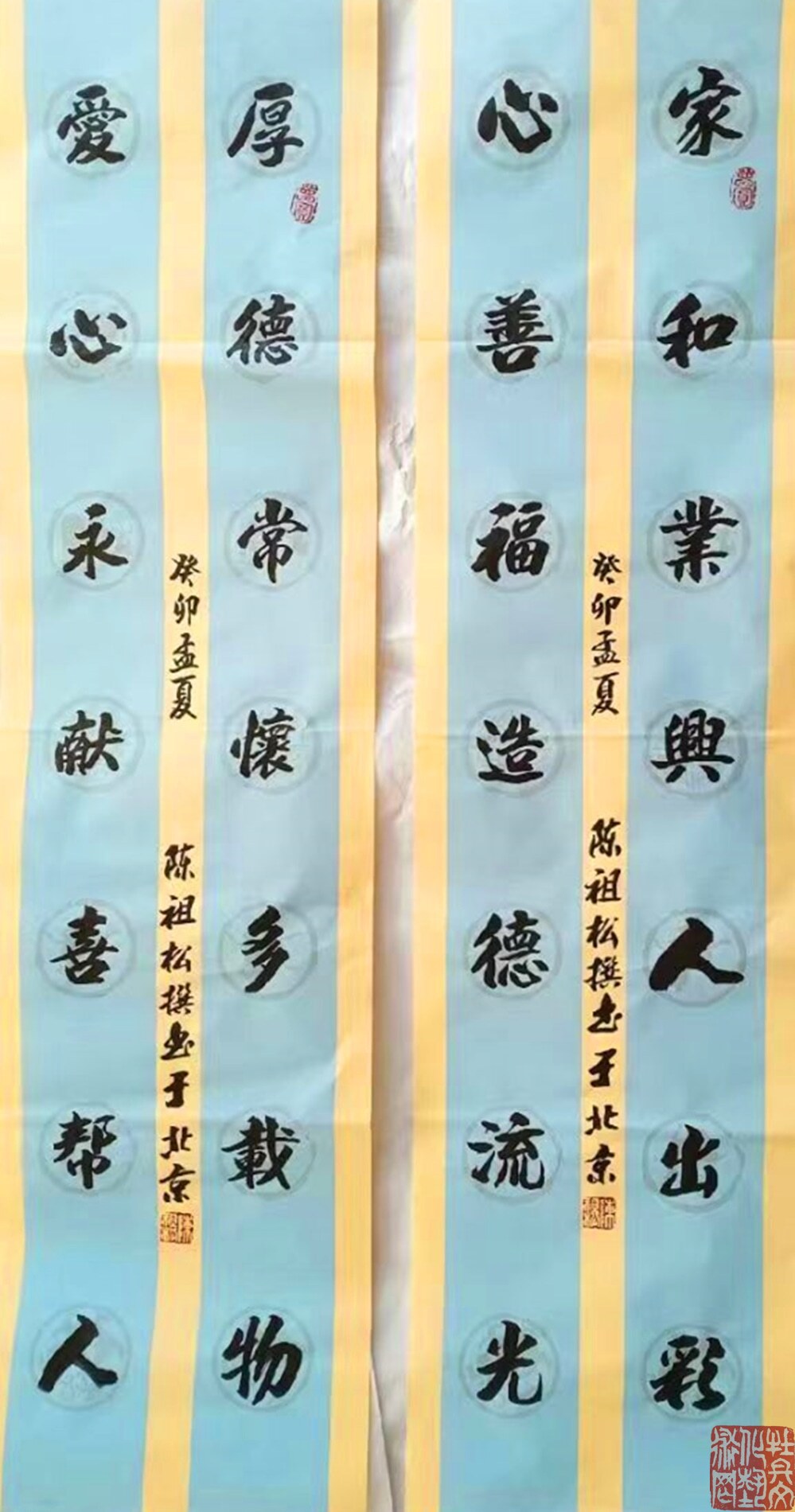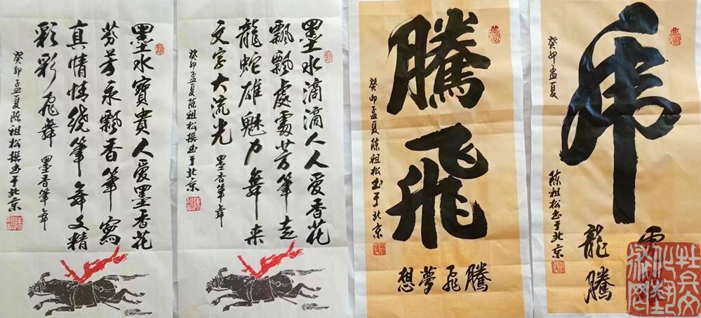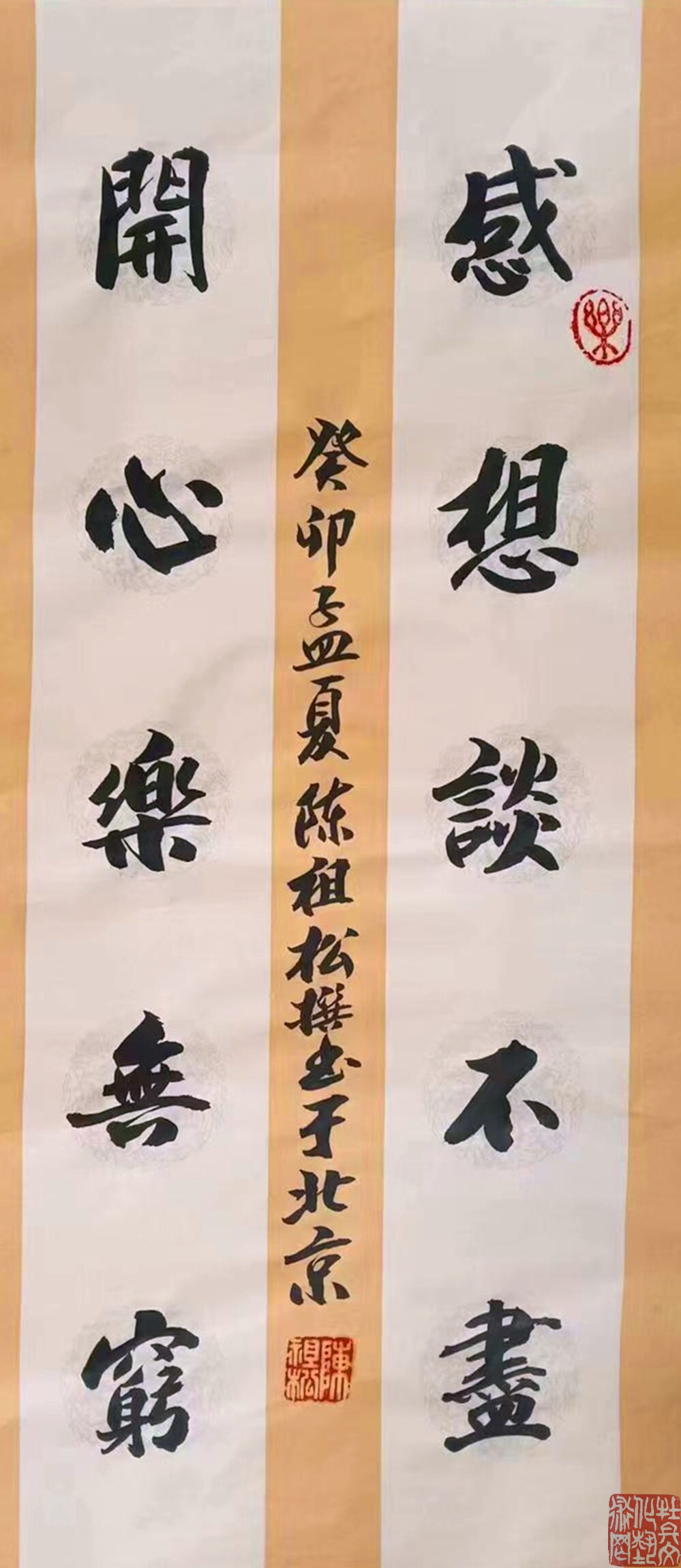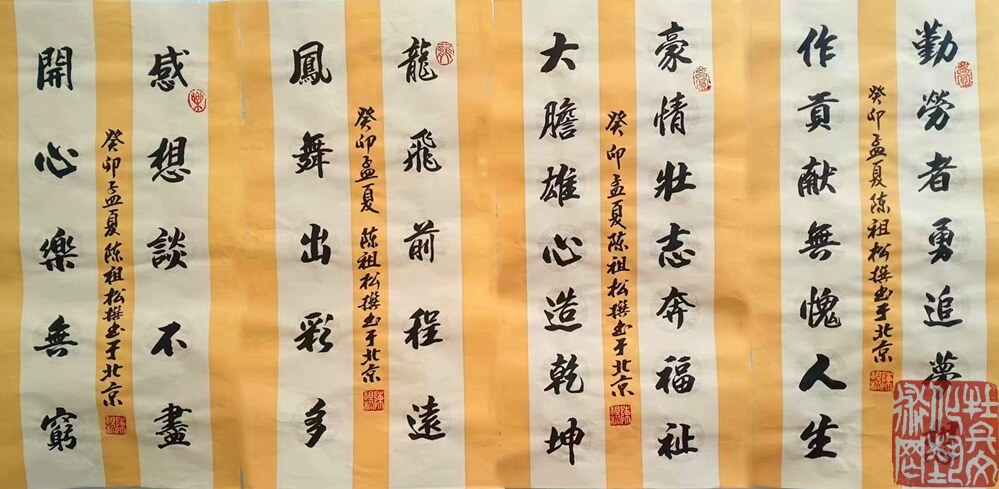 笔书励志书香醉,翰墨结缘墨彩飞。心痴书法的陈祖松正有声有色地创作流光溢彩之书法作品,尽其所能为书法事业作出可见的贡献。用传志之笔写出异彩纷呈之书法作品,弘扬国粹,点缀美丽的书法花园,靓丽千家万户;用飘香之墨书写新时代赞歌,歌颂国泰民安,为丰富万众文化生活增砖添瓦。常把心声传众耳,喜留手迹在人间。努力创作迎合新潮流鼓舞人生斗志之好作品,让大家乐观欣赏充满朝气饱含神韵之笔花墨彩,增加精神文化营养,享受书法墨香美餐。近二十年来,陈祖松用鲜活之文字创作出了几百首催人奋进之诗词和千余副激励斗志之对联,其中积德行善之格言警句赢得世人称赞。