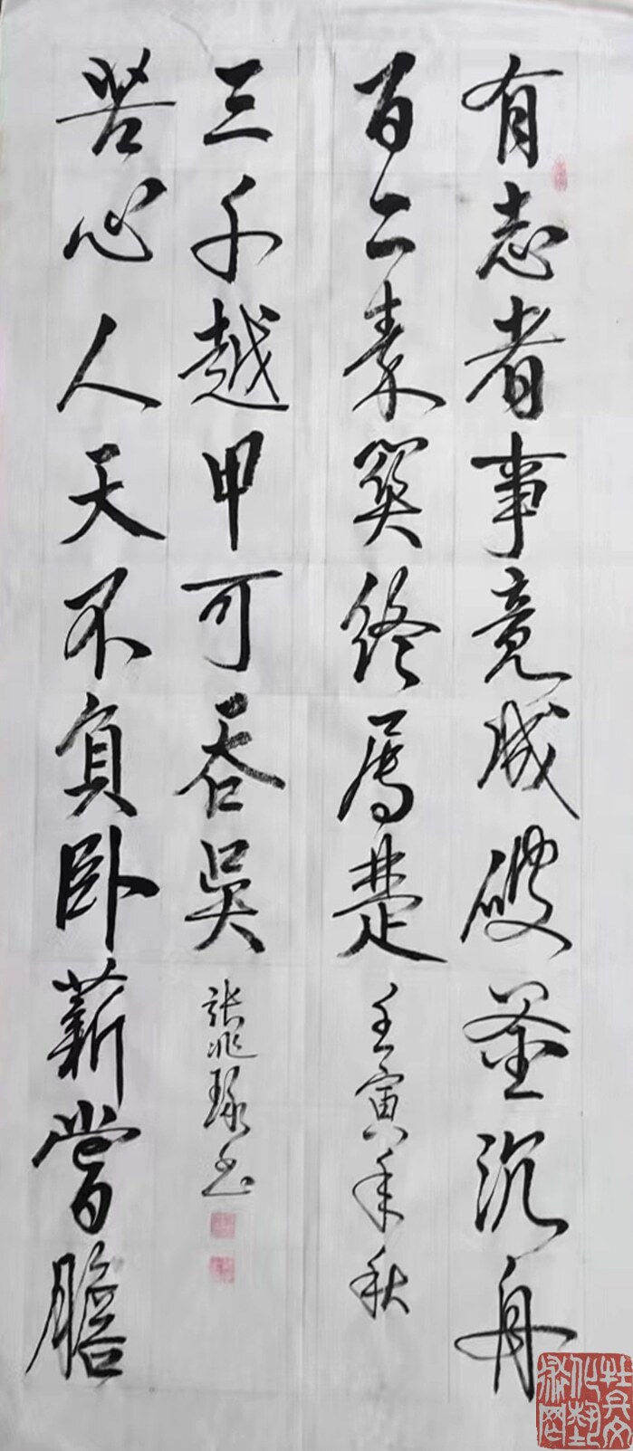张兆琢,山东菏泽牡丹区人,1947年出生,皇镇中学退休教师,菏泽市书法家协会会员,菏泽市老年书画协会研究员。受父亲影响,从小酷爱书法,从柳公权、玄秘塔碑入手,又学了欧体、颜体、赵体和魏碑。对篆书、隶书进行了一定的学习和研究。在正书的基础上,又学习了王曦之、张旭、怀素、孙过庭和等大家的行草书。书法作品多次在国家、省市参展并获奖。作品曾在国外展出。