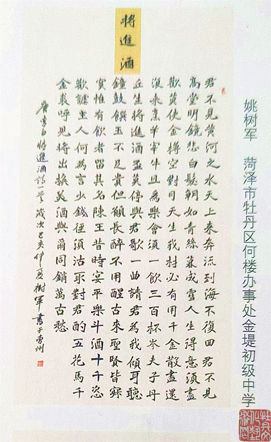 姚树军,男,汉族,生于1964年5月,系山东省菏泽市牡丹区何楼办事处郑桥村人,現住牡丹区将军苑小区。原为中学高级教师,自幼酷爱书法,始学欧体楷书,兼练二王行书,后从师刘鲁旭先生学习魏碑,曾荣获山东省笫三届教师书法比赛优秀奖。近年来,姚树军先生积极参与省、市、区组织的各类书法活动,并多次获奖。现为市书协会员,老年书画研究会会员,全国书法考级取得十级证书。他创作的《心经》作品,端装清秀,竞相收藏订购。今年他在菏泽中原古城成立了自己的工作室,创作、培训相辅相成。欢迎喜欢书法的朋友前来定制作品,也欢迎想学习书法的青少年朋友前来报名学习书法。