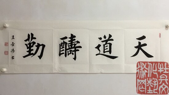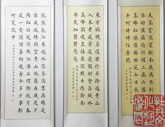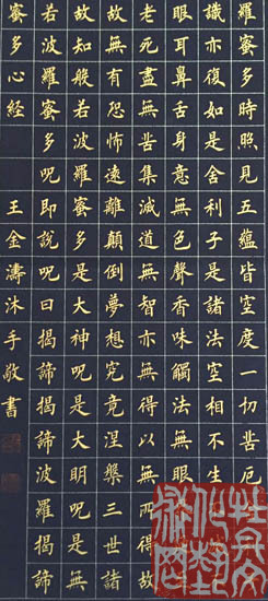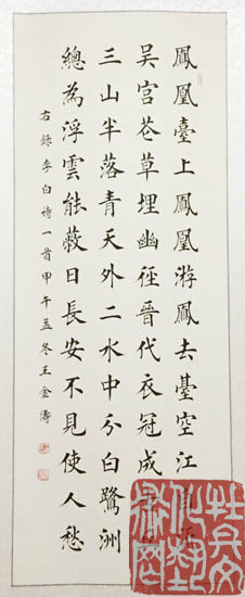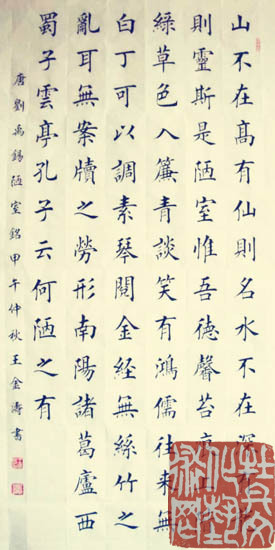 王金涛,1987年1月出生于书法世家,祖籍河南商丘,毕业于河南商丘师范大学。书法艺术研究院理事、中华全国书画家联合会会员。四岁开始随父学习书法,主攻欧体、兼习颜、柳、上至二王,几十年如一日,矢志不渝。他认为练字即练心,心若练明白,字自然就写好了。他以楷书为,笔力险劲,结构独特,用笔规矩端正,一丝不苟,大小有法,错落有致,布白匀称,笔画安排紧凑,法度森严,且能与方正中见险绝。他多次参加展览并被电视台、报刊报道。其作品求购收藏者众多,在全国各省市多次获得金奖。被授予“首批全国文化和谐使者”、“中华人民共和国功勋书画家”等荣誉称号;作品被“中华全国书画家联合会”永久收藏。作品获奖:“兰亭艺术大展”暨2011年全国书画大赛书法金奖;“名家•名作”书画家优秀作品邀请赛书法金奖;首届“和谐杯”全国诗书画摄影作品大展赛书法一等奖;第六届“阳光杯全国书画摄影诗文大赛”青年组书法特等奖;郑和杯国际书法艺术大赛银奖。