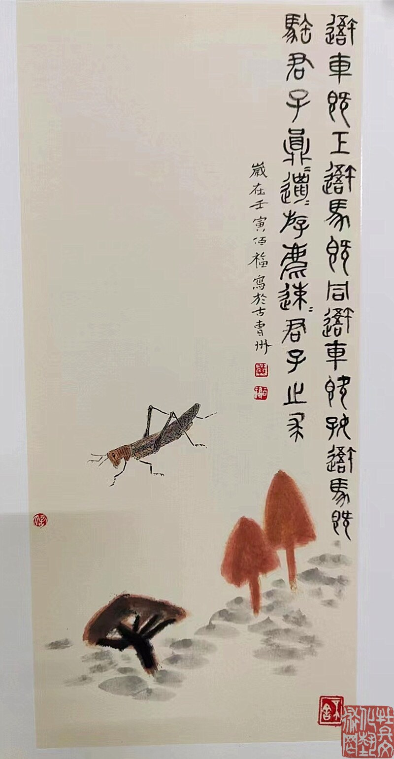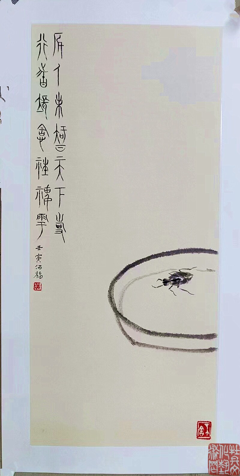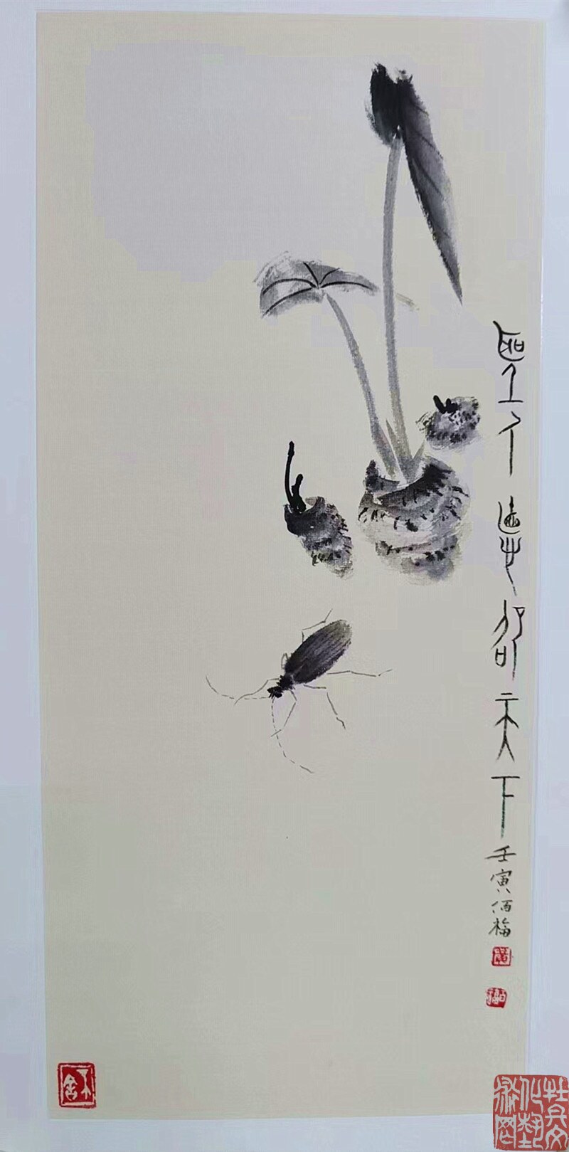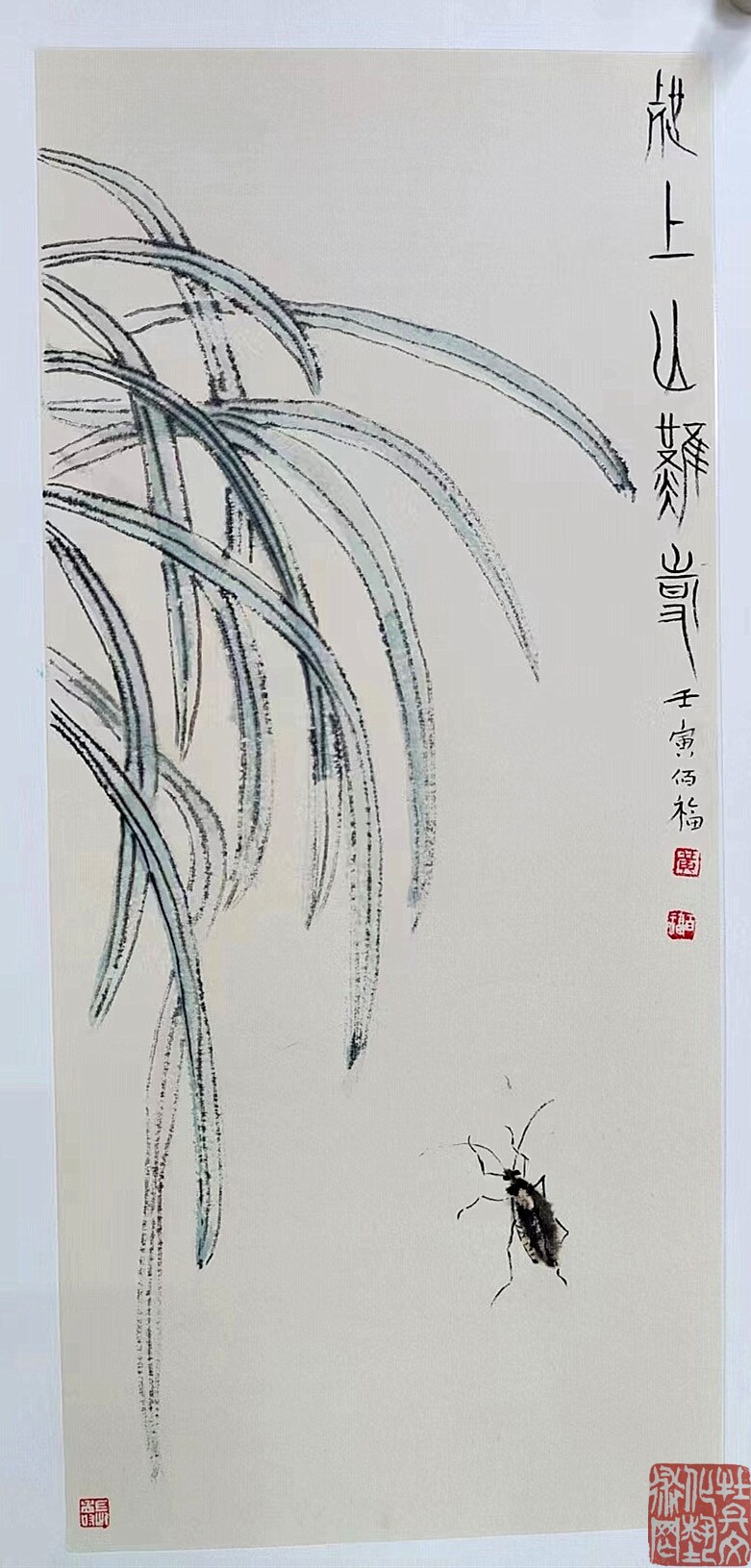 佰福画作以书入画,结构多以篆隶之法,不软媚流俗,临习人屋、老缶、潘天寿融汇古今。其作品水墨写意为主,形句夸张奇特,笔墨凝炼,风格雄奇隽永,独具新意,常常寥寥数笔,意境悠然。