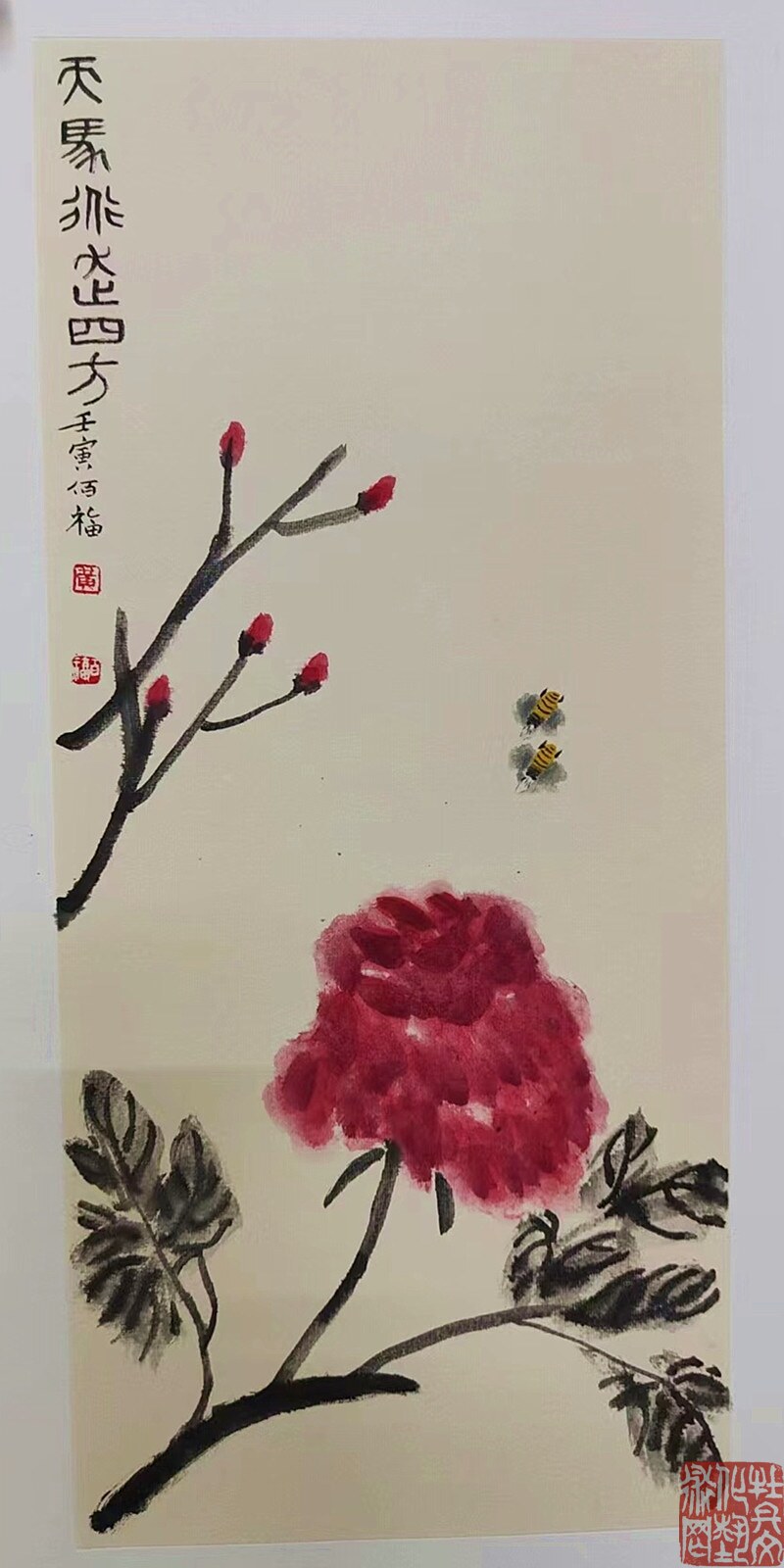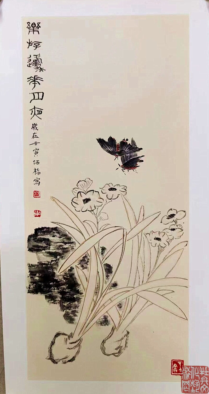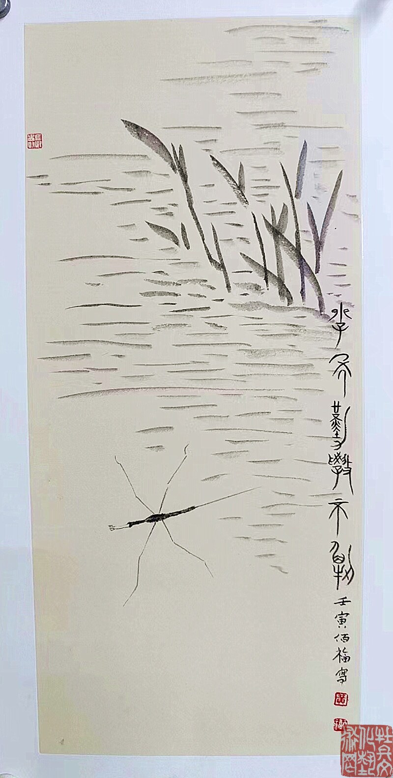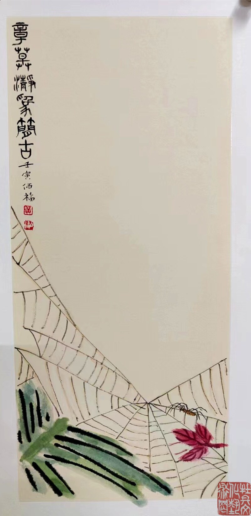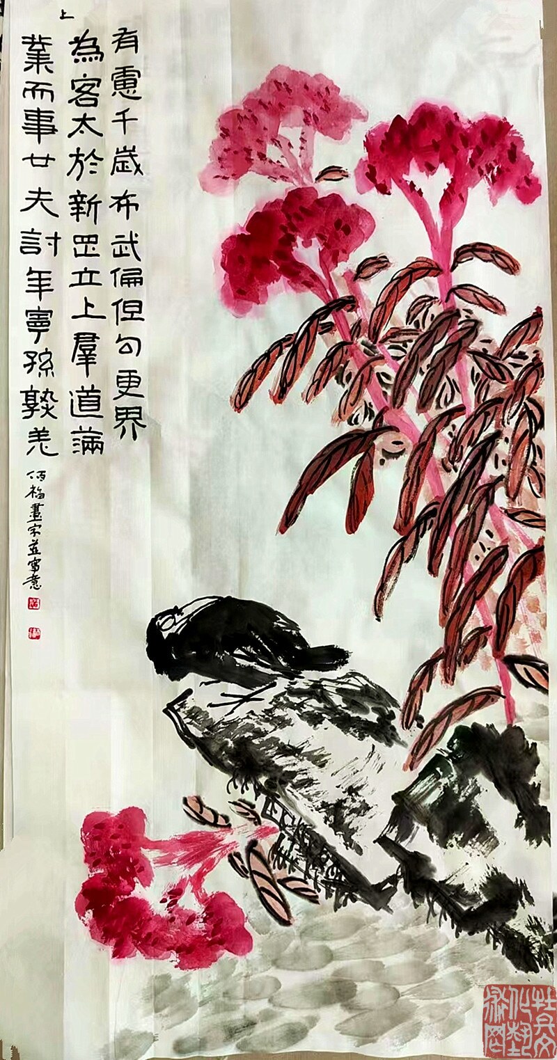 佰福画作以书入画,结构多以篆隶之法,不软媚流俗,临习人屋、老缶、潘天寿融汇古今。其作品水墨写意为主,形句夸张奇特,笔墨凝炼,风格雄奇隽永,独具新意,常常寥寥数笔,意境悠然。