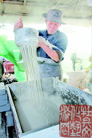 “和糊是把红薯淀粉像和面那样和成要求的糊状。”刘克锋说,和糊可不是一和就成的,要有一个懂技术的“老师儿”统一指挥。“老师儿”要把少量淀粉放进小盆内,加温水搅拌成稀乳状,称“芡糊”,然后加开水预热。把红薯淀粉和适量的白矾放入搅拌机内,加入开水搅拌…… “中间不能停歇,搅拌方向也不许改变……”“老师儿”王建军说。