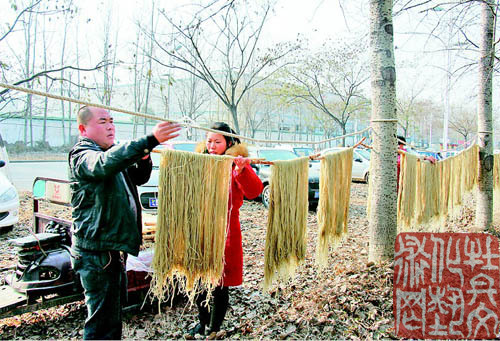 粉条上竿儿后,要在寒冷的夜间挂到外面自然冷冻,第二天解冻时,用木板拍打,除去冰碴儿后,用手把粉条散开晾晒2天即可。这一冻一解,便去掉了粉条的黏性。