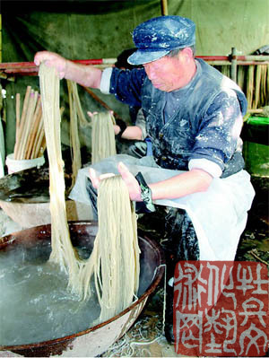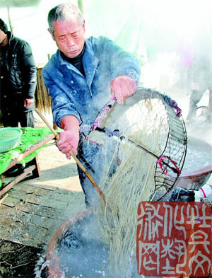 粉条下锅后,很快从沸水中浮出,有专人拿着特制的长筷子把粉条从锅中捞进盛有冷水的大盆里,冷却后,把粉条搭在一根短木棍上。短木棍长2尺左右,粗细均匀,称“粉条竿儿”。根据所需粉条的长短,把粉条截断。