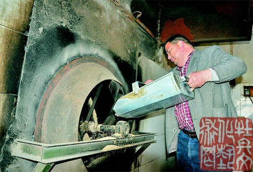 3月20日,牡丹晚报记者走进李国顺的香油厂区——坐落于后院的小磨坊。里面来阵阵香味,磨盘在电机的带动下正“悠闲”地转动,李国顺正忙碌着往磨盘里添加炒熟的芝麻粒。他说,现在,几乎整天与这十多台石磨打交道。
