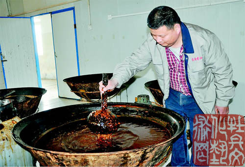 “这道工序是磨油坯,这是传统工艺制作小磨香油的一个重要环节。”李国顺说,制作小磨香油有几道工序:首先选上好的芝麻进行漂洗,用大锅炒熟,吹去杂质,然后用石磨磨成油坯,再加入沸水运用 “水代法”滤出香油。几道工序中,炒芝麻和墩油是关键环节,芝麻要炒到七成熟,搅拌要均匀,此外,墩油时加多少水量直接关系到香油的品质。