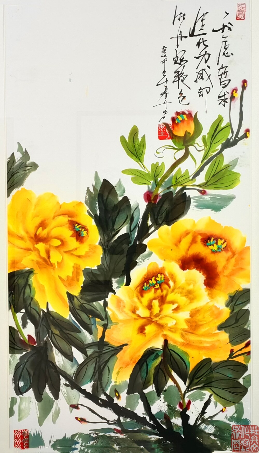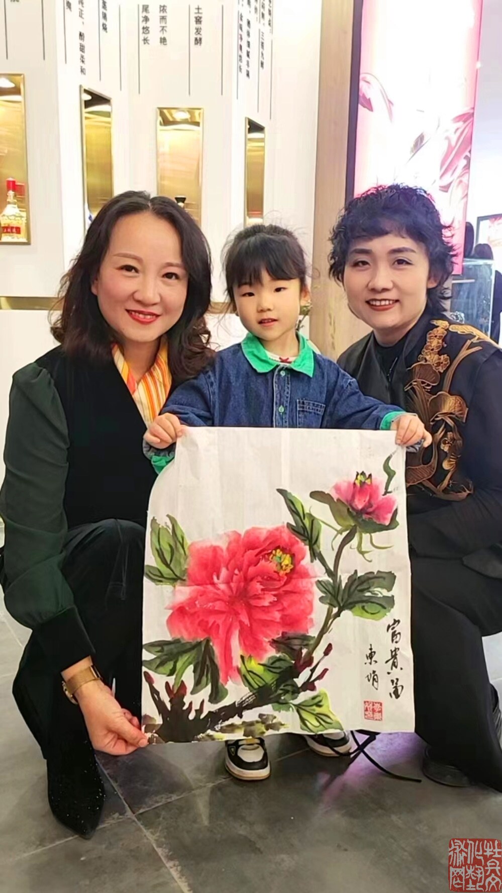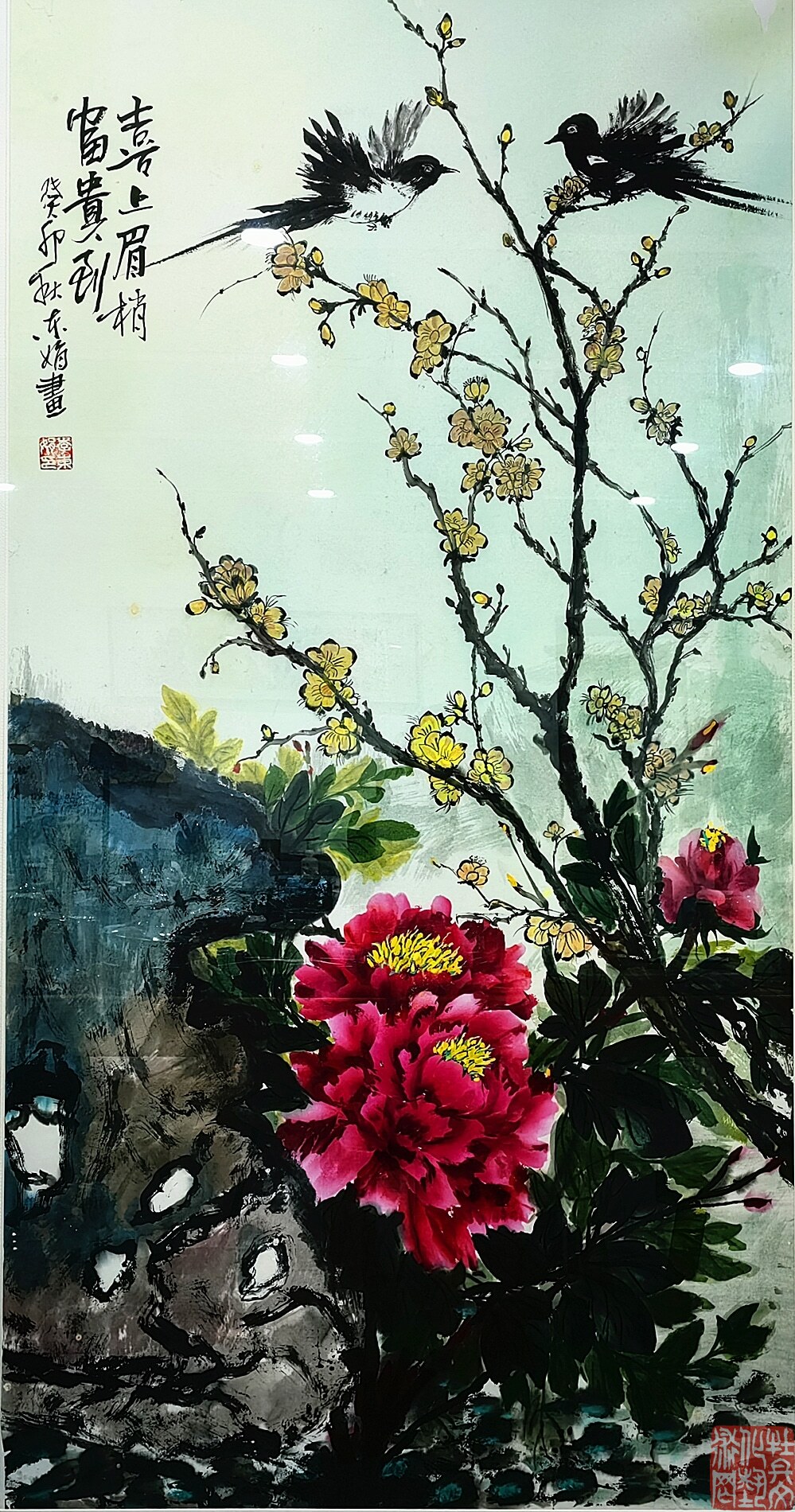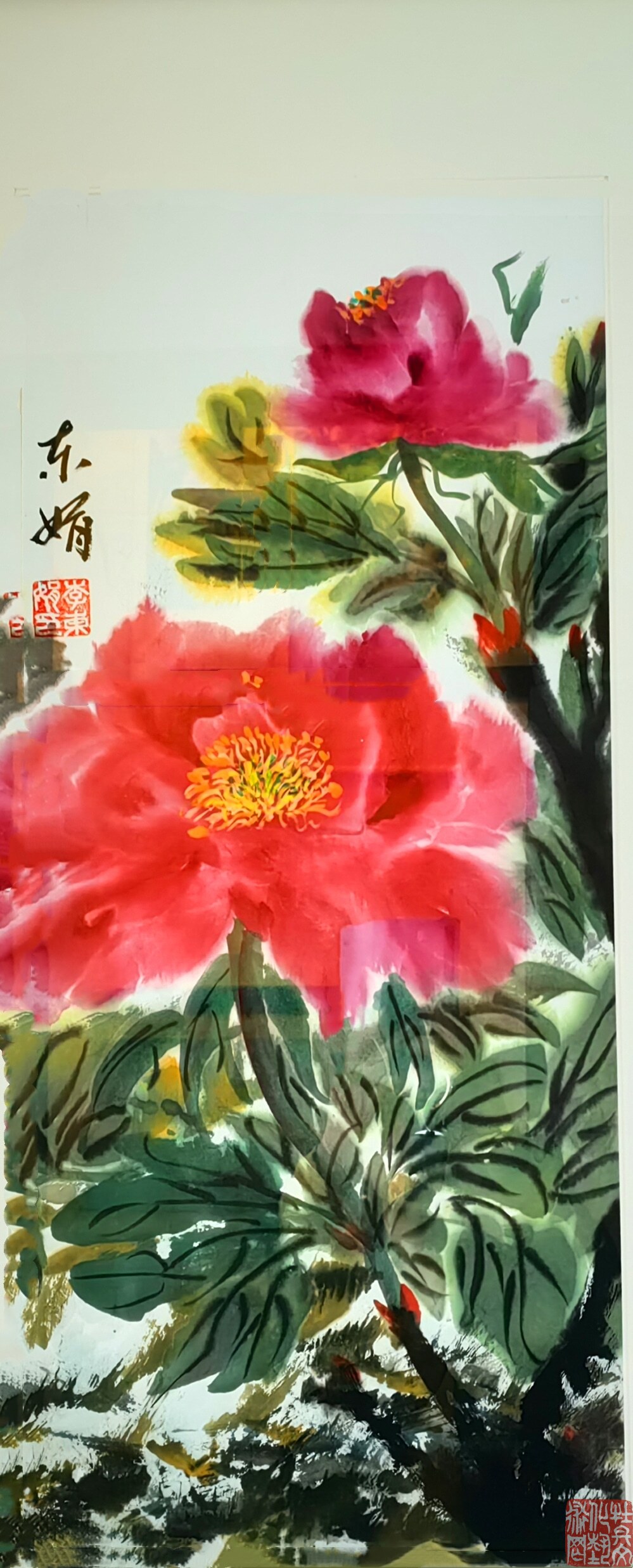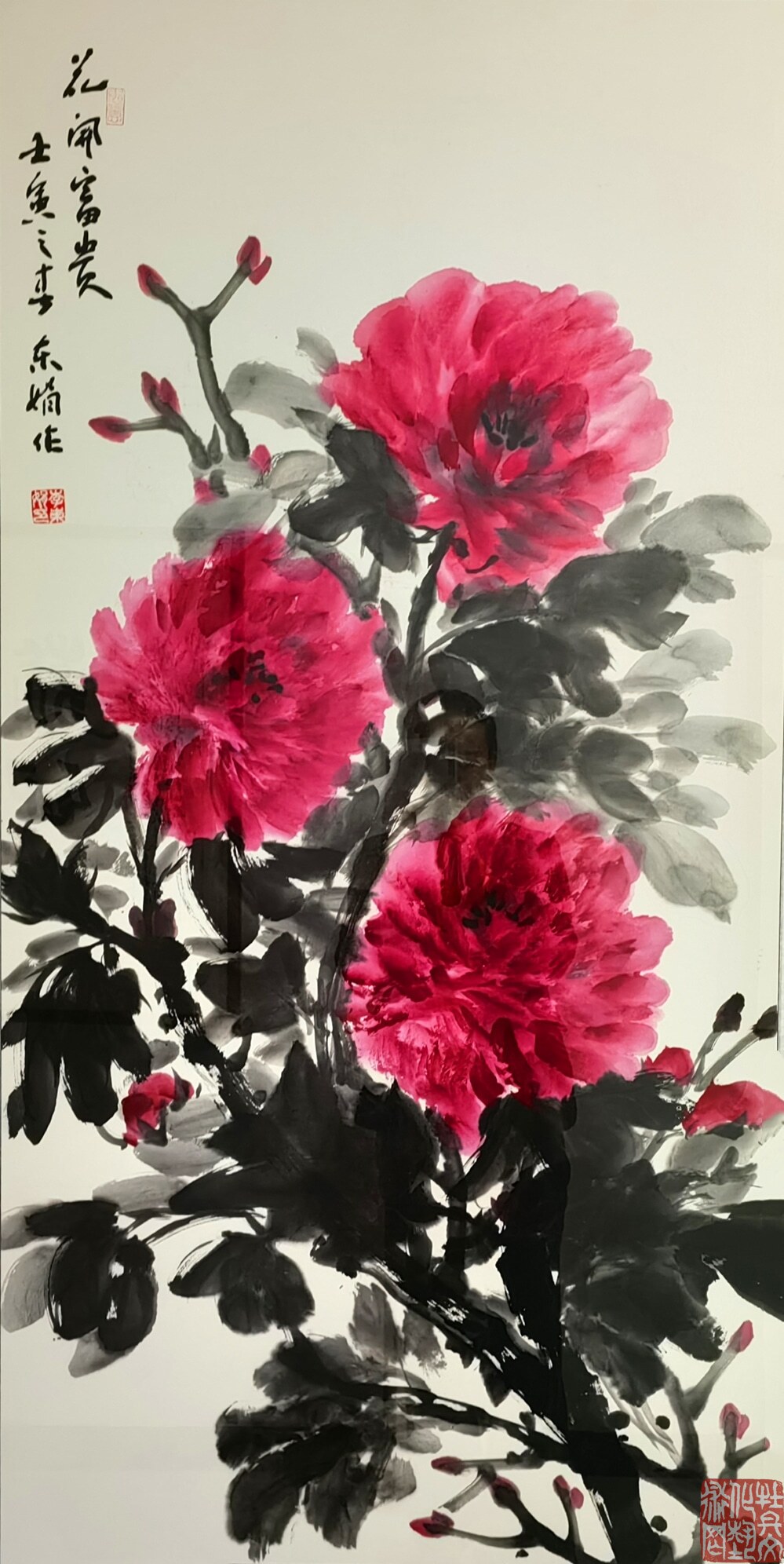 其牡丹作品富贵凝艳,厚重朴拙,姿态飘逸,构图大气,把牡丹之都的牡丹花鲜活的呈现出来,深得国画爱好者的喜欢。诗画原创“夜.凝艳”荣获菏泽市作品展一等奖。