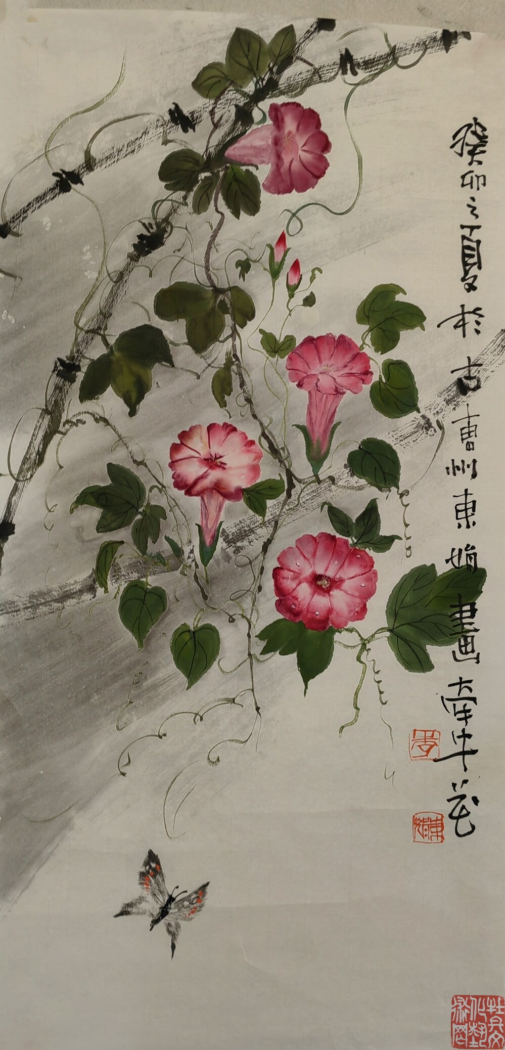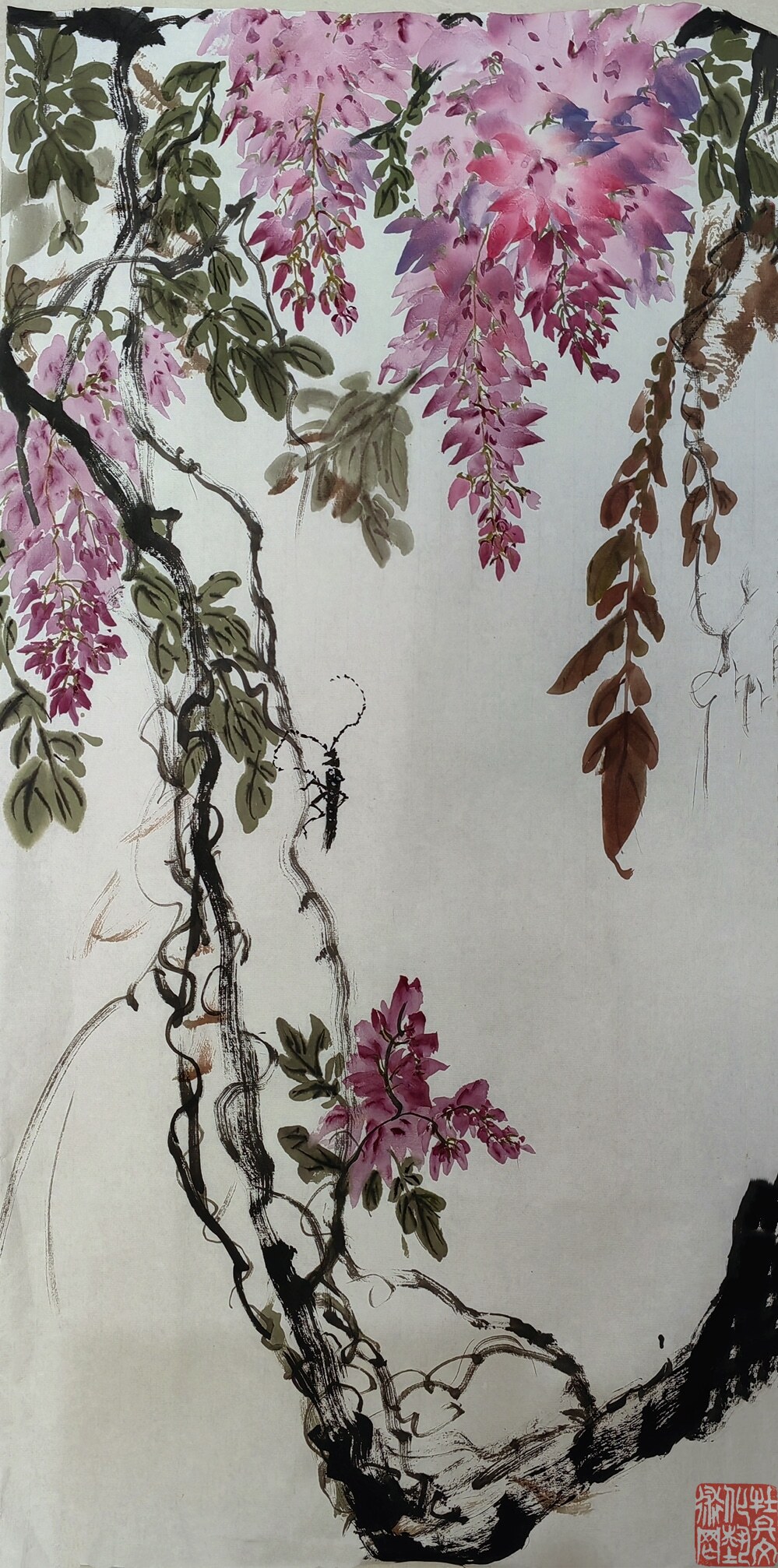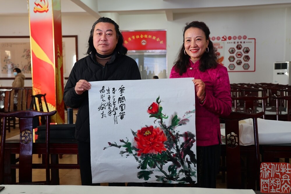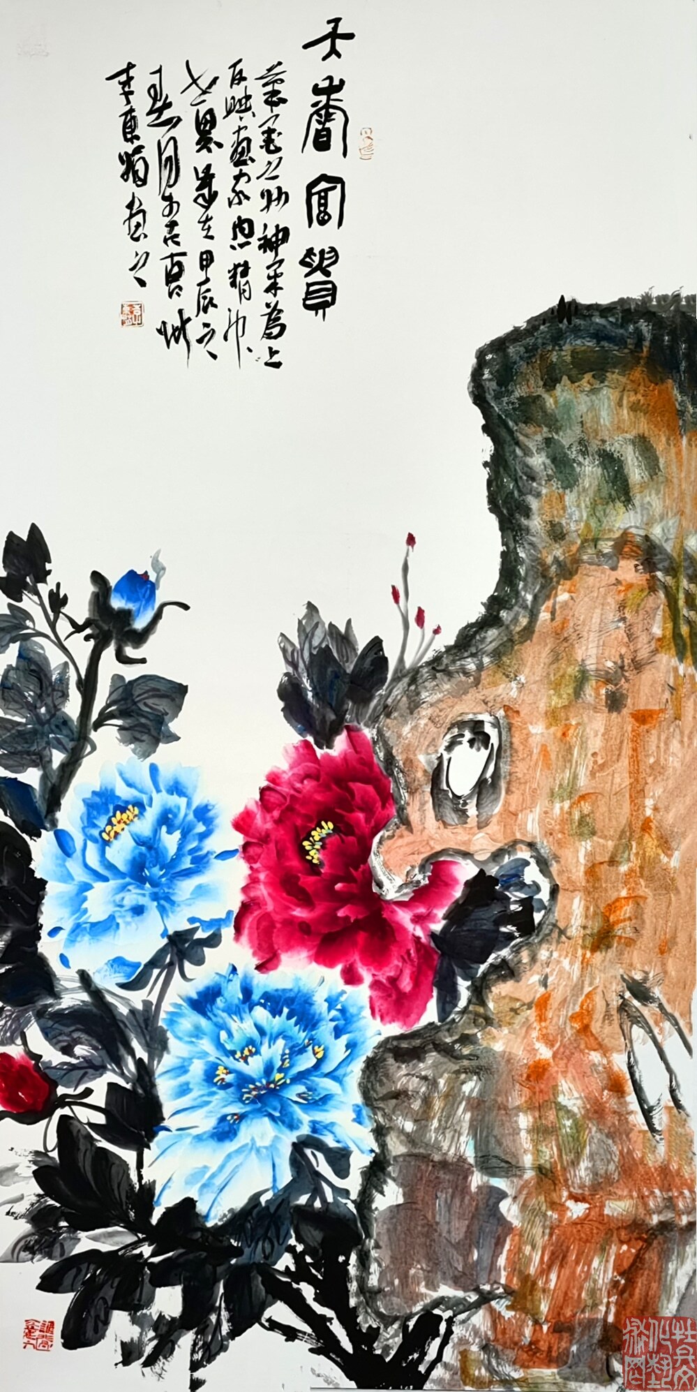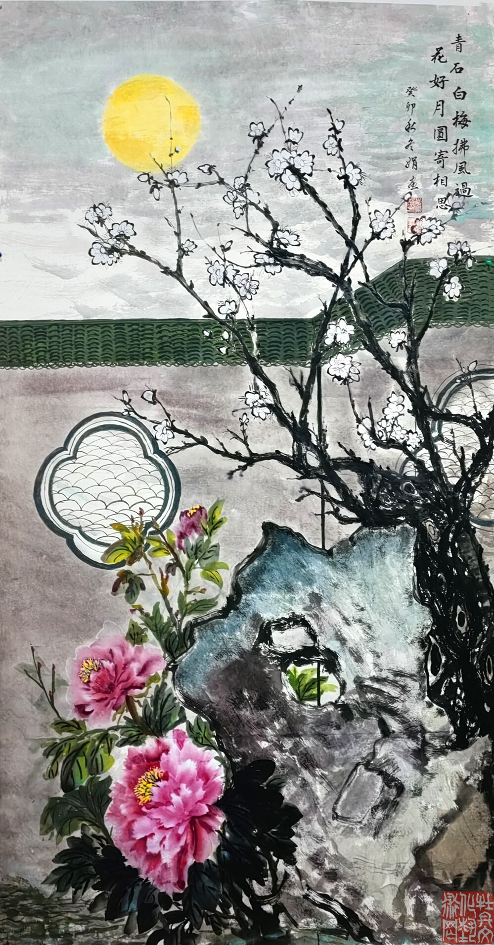 其牡丹作品富贵凝艳,厚重朴拙,姿态飘逸,构图大气,把牡丹之都的牡丹花鲜活的呈现出来,深得国画爱好者的喜欢。诗画原创“夜.凝艳”荣获菏泽市作品展一等奖。