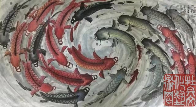 陈墨作品主要传承中华传统文化结合创意,线墨彩面触合,中太极鱼,雅俗共赏,深受同行、书画爱好喜爱,送结当代板大千。