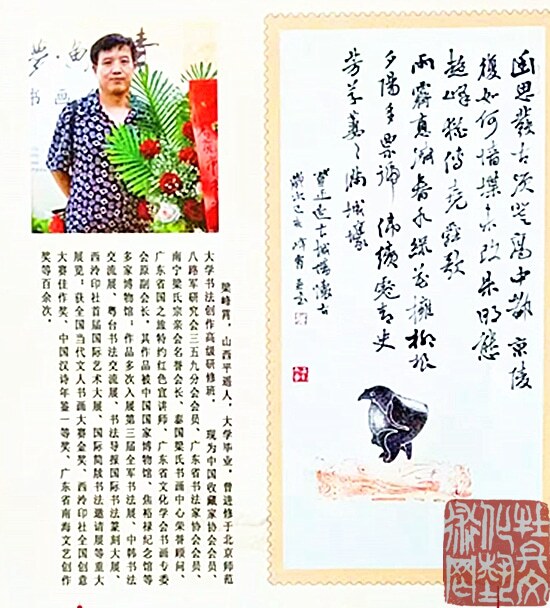 梁峰霄 ,广州市九三文化艺术研究院书画分院副院长,收藏家协会会员,广东省书法家协会会员,《书画报社》特聘书画家,曾任全国电视希望之星大赛广东赛区评委,梁楷杯全国书画大赛主任评委。作品赴日本、韩国、新加坡、台湾、香港、澳门等多个国家地区交流展出,并被国家博物馆、焦裕禄纪念馆等多家博物馆、碑林收藏、刻石;多次入展书协及省书协主办的第三届全军书法展、中韩书法交流展、粤台书法交流展、西泠印社创意艺术大赛佳作奖。书法导报国际书法篆刻大展、西泠印社首届国际艺术大展、国际简牍书法邀请展。山西省第八届书法展览等重大展览;获全国当代文人书画大赛金奖,广东省书法篆刻高奖-南雅奖,驻港部队新闻报道先进个人,广东省南海文艺创作奖,平遥文化研究先进个人等奖百余次。五十米书法长卷作为驻港部队礼品赠送澳门。《试论简牍书法》《略谈军人与书法》等多篇论文、作品发表于《书法》《书法》《书法报》《书画报》《书法导报》。《人民日报》、中央人民广播电台、《画报》、香港《文汇报》、《羲之书画报》、《山西文学》《民营经济报》、《文艺周报》等数十家媒体、网站专题介绍。载入《书画名家传世大辞典》、《国际书法篆刻大展作品集》等十几部权威典籍。多次举办个人书法展。著有《梁峰霄书法艺术作品集》、《梁峰霄书画篆刻》、《平遥古城楹联集》、《梁峰霄简牍书法千字文》。