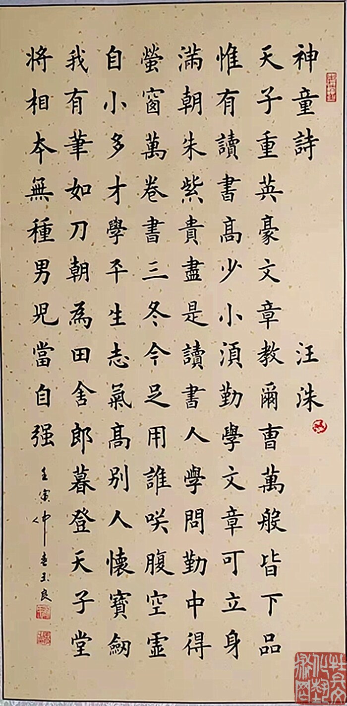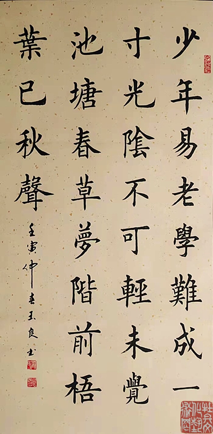 刘玉良,墨宝轩主人,河北省 廊坊市 文安县人 。国家一级书法师,燕雄书画院常务秘书长,鼎智传媒.金九书画院副院长,河北省毛体书法协会廊坊工委副,书画家协会会员,世界华人书画家协会高级院士,硬笔书法协会会员,廊坊市硬笔书法协会会员。河北省沧州毛体书法研究会 沧州分会常务秘书长。 出生于书香门第,受家庭影响自幼酷爱书法,1992年书画函大结业打下坚实的书法基础,楷书主要研习欧阳询《九成宫》隶书《曹全碑》《乙瑛碑》《华山庙碑》等。 2015年届全国书法艺术网络大赛年终总决赛中获优秀奖,2016年首届“伟人颂.永远的怀念”全国书画大赛中作品荣获`金'奖并授予红色艺术家荣誉称号,2017年在`东盛福’杯民间书法展活动中获 书法作品展`金’奖。 多次应邀参加名家公益书画活动。
