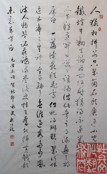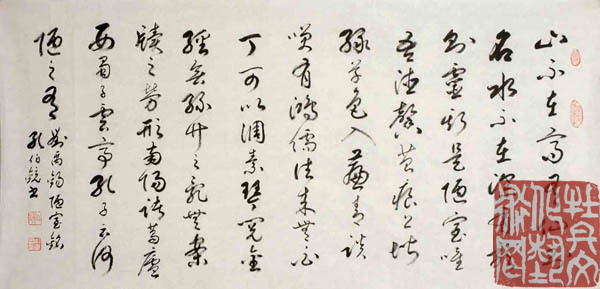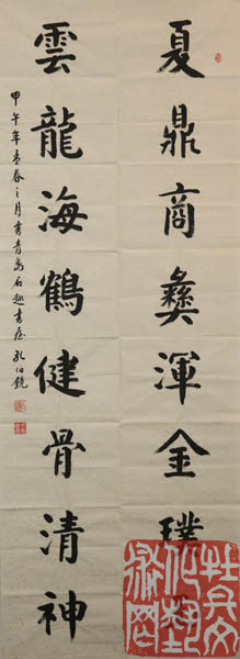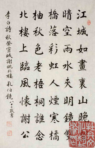 孔伯镜,名庆寰,以字行。1927年出生,籍贯定陶,1951年起定居菏泽市,现为山东省书协会员、山东中山书画研究会顾问(曾任副会长)、菏泽市书法艺术研究会顾问、曹州书画院书画师、扬州书画院书画师。幼承庭训,读书习字。20世纪40年代左右,受晚清宿儒曹铁如先生(文史馆馆员)、蒋芝兰先生(晚清岁进士)启蒙教育,读经书、古文、诗词、临习唐楷。一生从事语文教学,时任写字课程。自幼耽嗜书法,由临摹碑帖入手。初自晋唐以至明清,典型书迹多 所临习。后于二王诸帖、《孙过庭书谱》、《智永真草千字文》等用功尤笃。并对商周、秦汉篆隶书迹时有涉猎。于石鼓、泰山刻石、杨沂孙书说文序言、小篆偏旁部首下过功夫。 并借鉴有清以来邓石如、杨沂孙、吴昌硕诸家。自上世纪70年代以来,参加国内外书画活动,曾获受奖、刻石、出版、收藏之誉。80年代前后,参加山东省书画研究究会书法展、晋冀鲁豫四省书法联展、黄河流域十省书法联展、昆嵛山书法展。2000年以来,作品收藏于聂荣臻元帅纪念馆、人民大会堂、民革中央机关等。三次赴日本参加中日友好书法交流展,先后于东京、大阪、奈良、坭崎、丹波等城市现场作书,并在坭崎市大剧院现场做径米榜书表演,作品为其收藏,皆有新闻媒体报道,2000年荣获世界华人艺术展佳作奖,并被授予世界华人艺术人才称号。2001年参加中日书法名将展,获金奖,载入《中日书法名将集》。2001年应邀参加泰山笔会,作品为管委会收藏。2001年为桂陵之战古迹《义战亭》题匾。2002年参加韩国鸡笼山中日韩书画联展作品入专集。2002年参加美国芝加哥华人书法联展,获得好评,作品为当地书协收藏,并增聘名誉之衔。2004年为民族英烈赵登禹将军题纪念碑。2006年,曾向学者史树青先生问学,史先生给予鼓励:“能坐下来临习碑帖,吸纳百家,必然出新,自成面貌,很好!”。2007年纪念中日恢复邦交35周年,《日本书法》中日友好版式以《孔伯镜的天地》为标题,刊载作品多幅。由中日韩艺术文化交流会会长土井白亭先生作专题评论,概括为:“集历代书家之长,自成恬淡秀逸之体,大有明末清初之韵味”。2010年在曹州书画院举办《孔伯镜先生书法艺术展》,并出版《孔伯镜书法艺术》一书。2011年,孔伯镜先生被《菏泽百年名人大观》一书收录。2012年在菏泽市博物馆举办《孔伯镜师徒书法作品展》,并出版《惠风和畅》孔伯镜师徒书法作品专集。2012年由菏泽市举办的“于法杰、张剑萍、谢孔宾、孔伯镜、王宗普五老书法艺术展”,并出版《曹州五老峰》作品专集。2015年,以孔伯镜作品和肖像为素材的相关资料,经国家邮政部门审批,予以出版素有“国家名片”之誉的邮票。并被“纪念人民抗日战争暨世界反法西斯战争胜利七十周年”为主题的《邮册》收录。