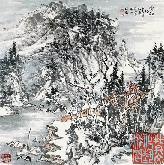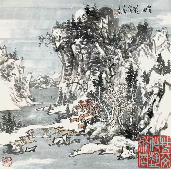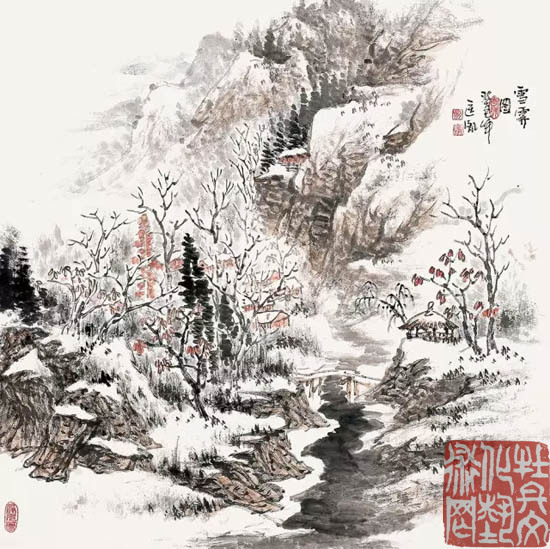 雪景是大自然的精彩杰作,千姿百态,随物赋形,令人心旷神怡,遐思联翩,在传统山水画中,雪景山水是受人喜爱和有影响的题材之一。作者尤喜画雪景,他善于大胆地概括和剪裁,用精练的笔墨把观者引入诗一般的境界,纵览几幅斗方作品,画笔峭拔刚劲,墨色浑厚古朴,线条富有变化和张力,寒意之中充满了无限的生机。画面有雪处留白,“计白当墨”,虚中有实,境界显得很开阔,幅幅画面宁静安详,神韵精致,气脉贯通,格局新颖,体现了以少胜多、空灵深邃的格局。每幅作品均呈现出一个异常广阔、旷远的空间,粗看意境深邃,细品回味无穷。
