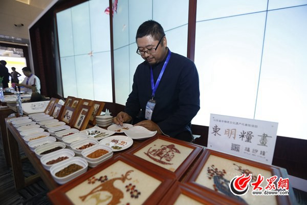 由非遗传人韩国瑞创作的一幅幅“粮食画”,吸引了不少中外嘉宾驻足观看。与传统的水墨画不同,这些粮画由谷子、芝麻、小米、玉米、红玉米、黄豆瓣、蚕豆、黑豆、红豆、花种子等材料制作而成。东明粮画制作技艺是第四批省级非物质文化遗产代表性项目,迄今已有一千七百多年的历史,主要是巧妙利用各种粮食种子的自然形状和颜色,经过防腐防虫处理后,精心拼粘,创作而成的一种传统民间工艺画,一般以书法、山水、花鸟、人物和吉祥图案为主,具有“国泰民安、五谷丰登”的美好寓意。