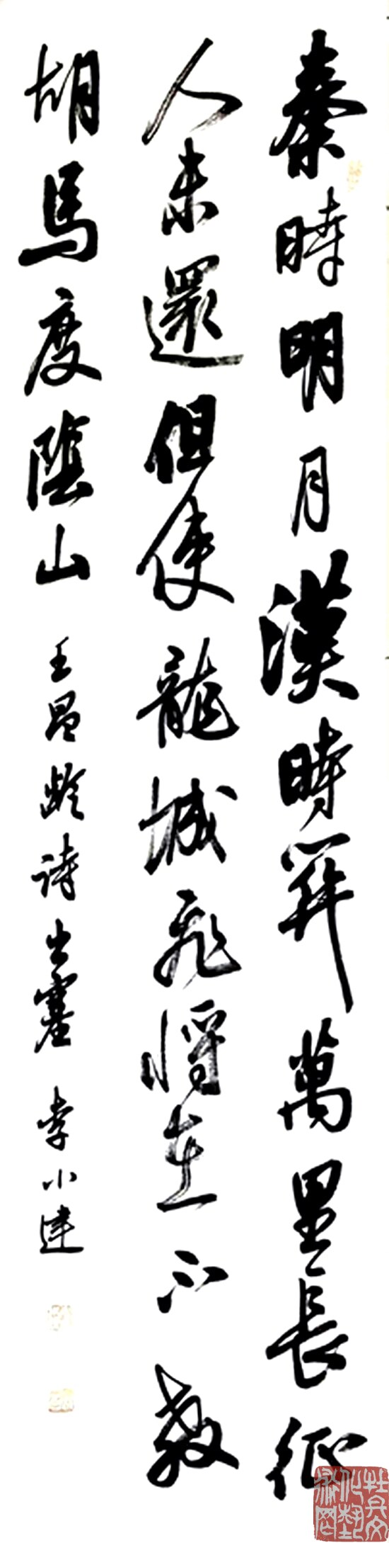 李小建,号墨寰,笔名观月楼主。毕业于南京政治学院,书法家协会会员、周口明德翰墨美术馆馆长,九州枫林书法研究院院士。 1968年5月生于河南书香之家,幼承家教,初学颜、柳法帖,后研习二王、怀素、孙过庭、王铎等书法。取法二王法帖,浸润释道之学,对书法追根求源,博览古今先贤书论典籍。钟情王铎书风,潜心研习其“书法用笔,出规入矩,张弛有度,充满流转自如,力道千钧的力量”,十年求索,深得三味,渐成笔法大气,劲健洒脱,淋漓痛快之风范。 作品收录《西安碑林》、《中华华夏书法精品集》、《沈丘书法集》、《周口书法》、《阳城书画作品集》等,出版有《李小建书法集》。