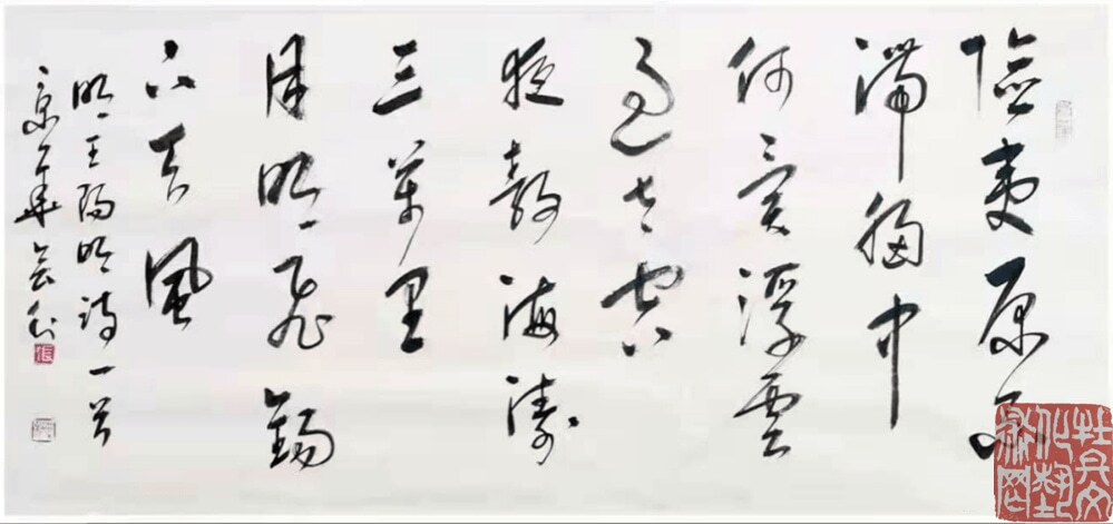 不但精于缪篆,在篆刻方面也精进。取法汉印,天质自然,印文为缪篆,转折处方中带圆,圆中带方,不露圭角,疏密但率。情怀万里,弘扬志气,则借书法抒性,打开书作,欣然如会面,更是自然赏心悦目,浓妆淡抹总相宜的艺术境界。