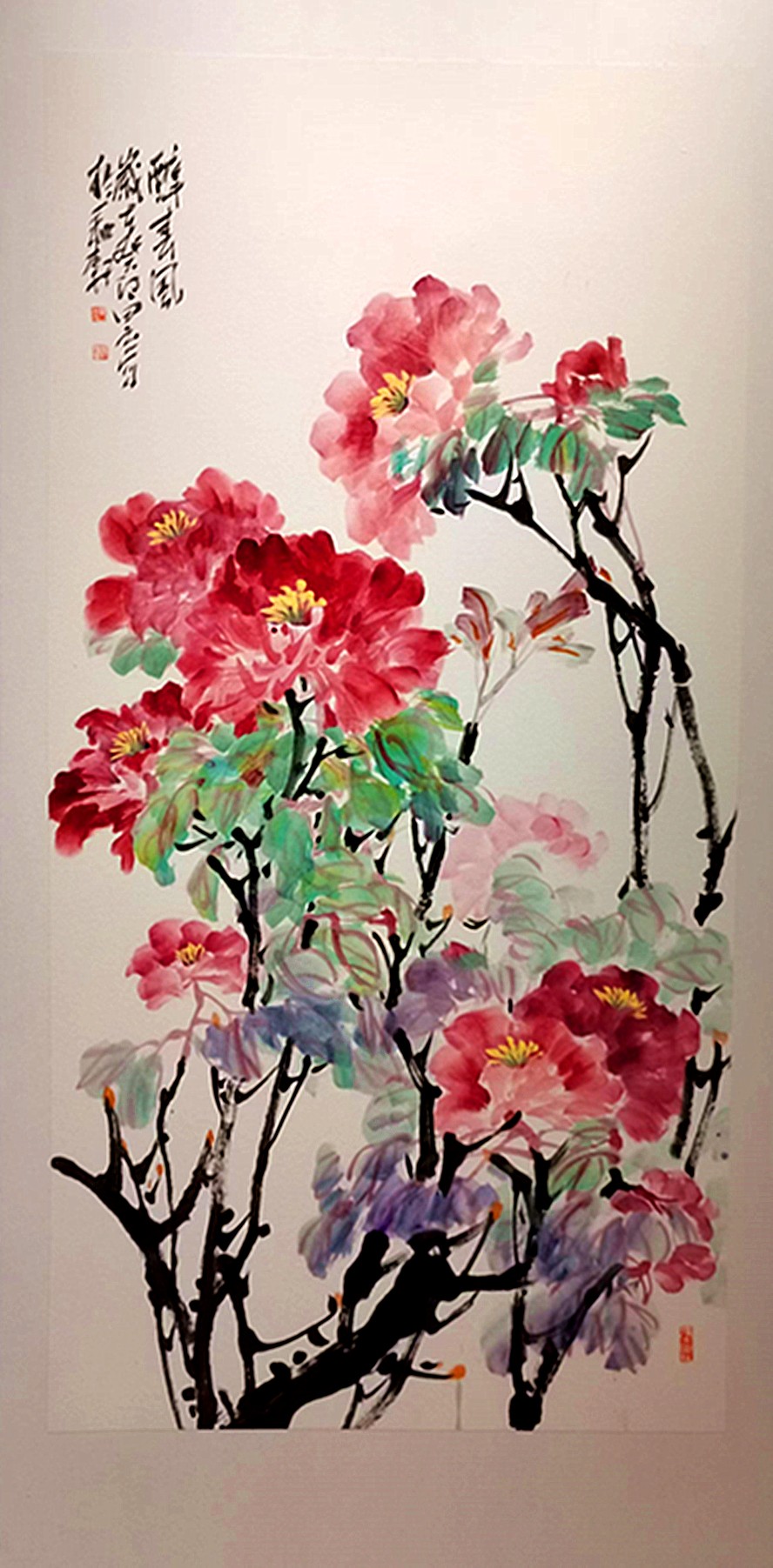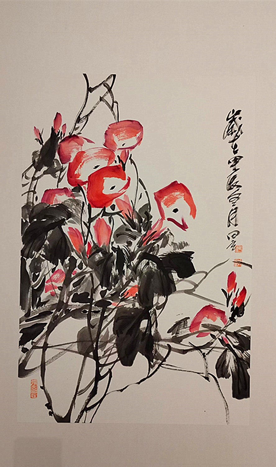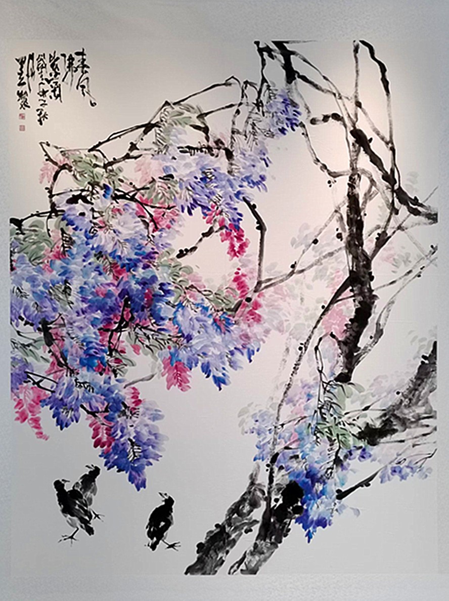 田立在出色完成美术教学义务的基础上,一直努力提升个人的美术素养,在美术方面取得了很大的成就。在他的作品中,牡丹清艳清媚,牵牛娇丽娇小,紫藤柔韧柔情,葵花热烈热辣。从夏的斑斓,秋的色彩,冬的沉静,到春的生机,皆在他的画笔下展现得淋漓尽致。此次展览的花鸟画都是他的精品之作。田立以花之繁郁歌人间芳华,以墨之葱茏摹时代气象,以笔之蓬勃画岁月生机,以心之热烈映丹青光芒。无论是牡丹之雍容端庄,梅花之老郁奇崛,还是紫藤之瘦骨崚嶒,青竹之静雅苍润,都写意着他的天然性情,展示着他的纯真意气。